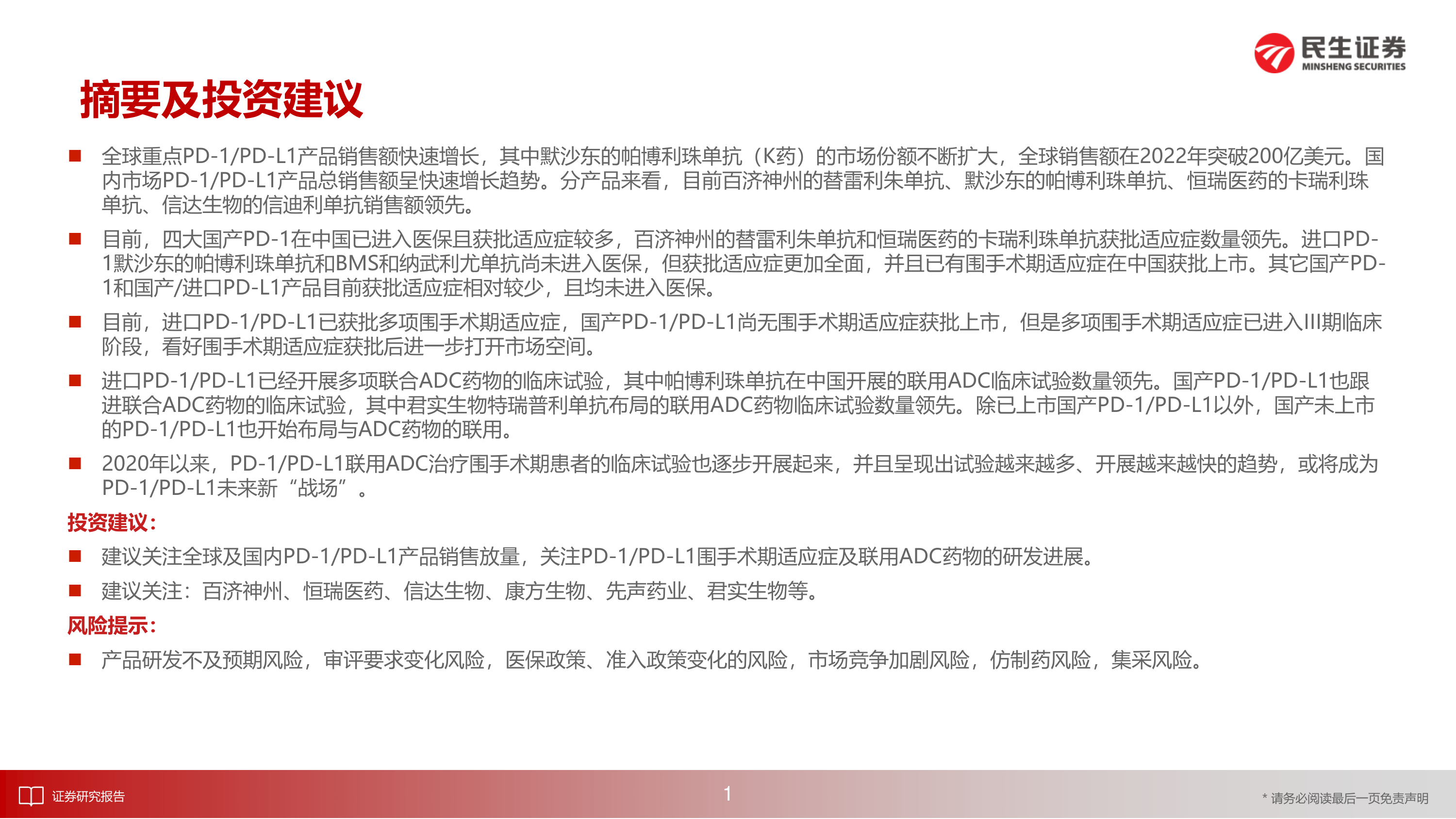 建议关注全球及国内PD-1/PD-L1产品销售放量,关注PD-1/PD-L1围手术期适应症及联用ADC药物的研发进展。