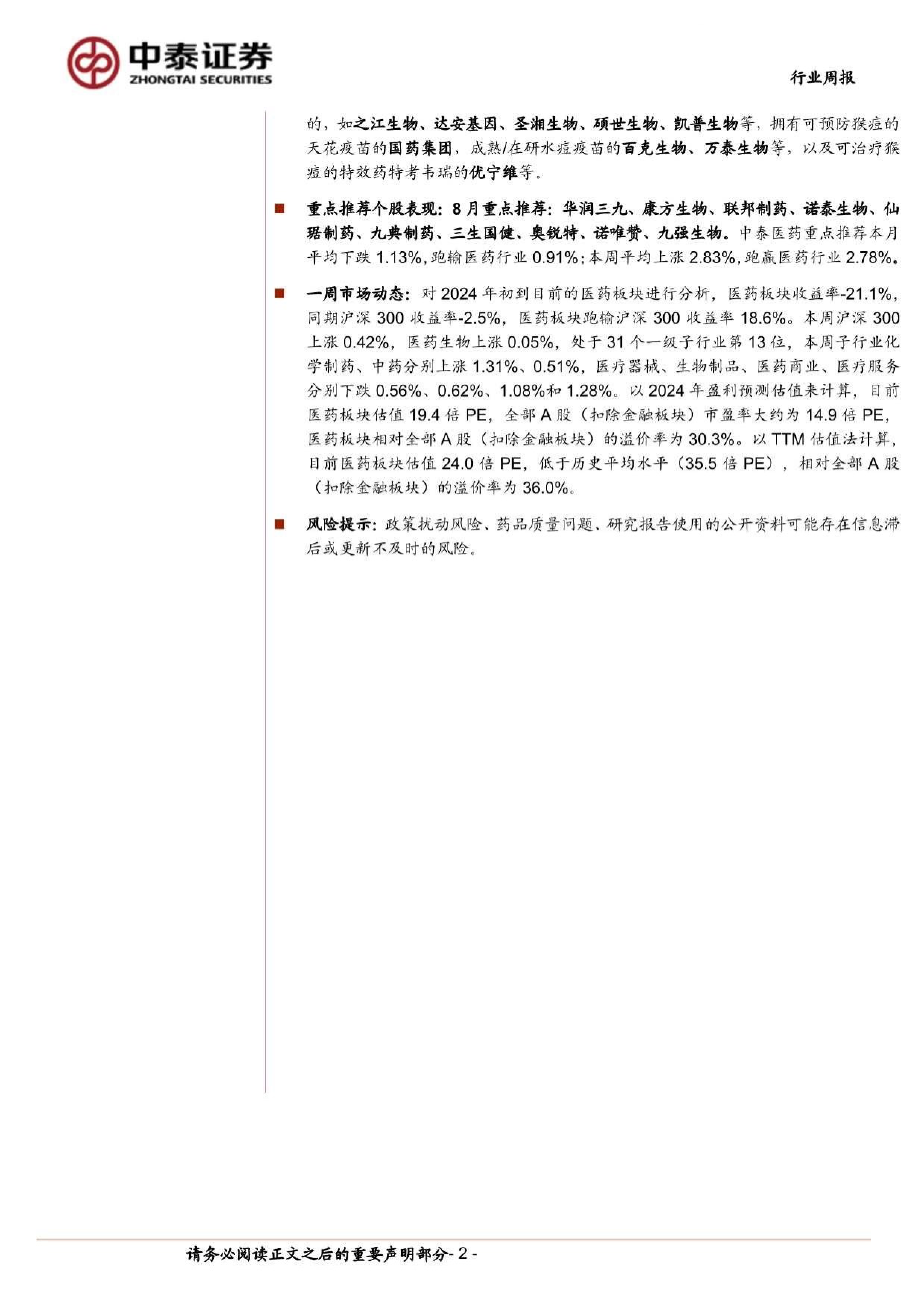 一周市场动态:对2024年初到目前的医药板块进行分析,医药板块收益率-21.1%,同期沪深300收益率-2.5%,医药板块跑输沪深300收益率18.6%。本周沪深300上涨0.42%,医药生物上涨0.05%,处于31个一级子行业第13位,本周子行业化学制药、中药分别上涨1.31%、0.51%,医疗器械、生物制品、医药商业、医疗服务分别下跌0.56%、0.62%、1.08%和1.28%。以2024年盈利预测估值来计算,目前医药板块估值19.4倍PE,全部A股(扣除金融板块)市盈率大约为14.9倍PE,医药板块相对全部A股(扣除金融板块)的溢价率为30.3%。以TTM估值法计算,目前医药板块估值24.0倍PE,低于历史平均水平(35.5倍PE),相对全部A股(扣除金融板块)的溢价率为36.0%。