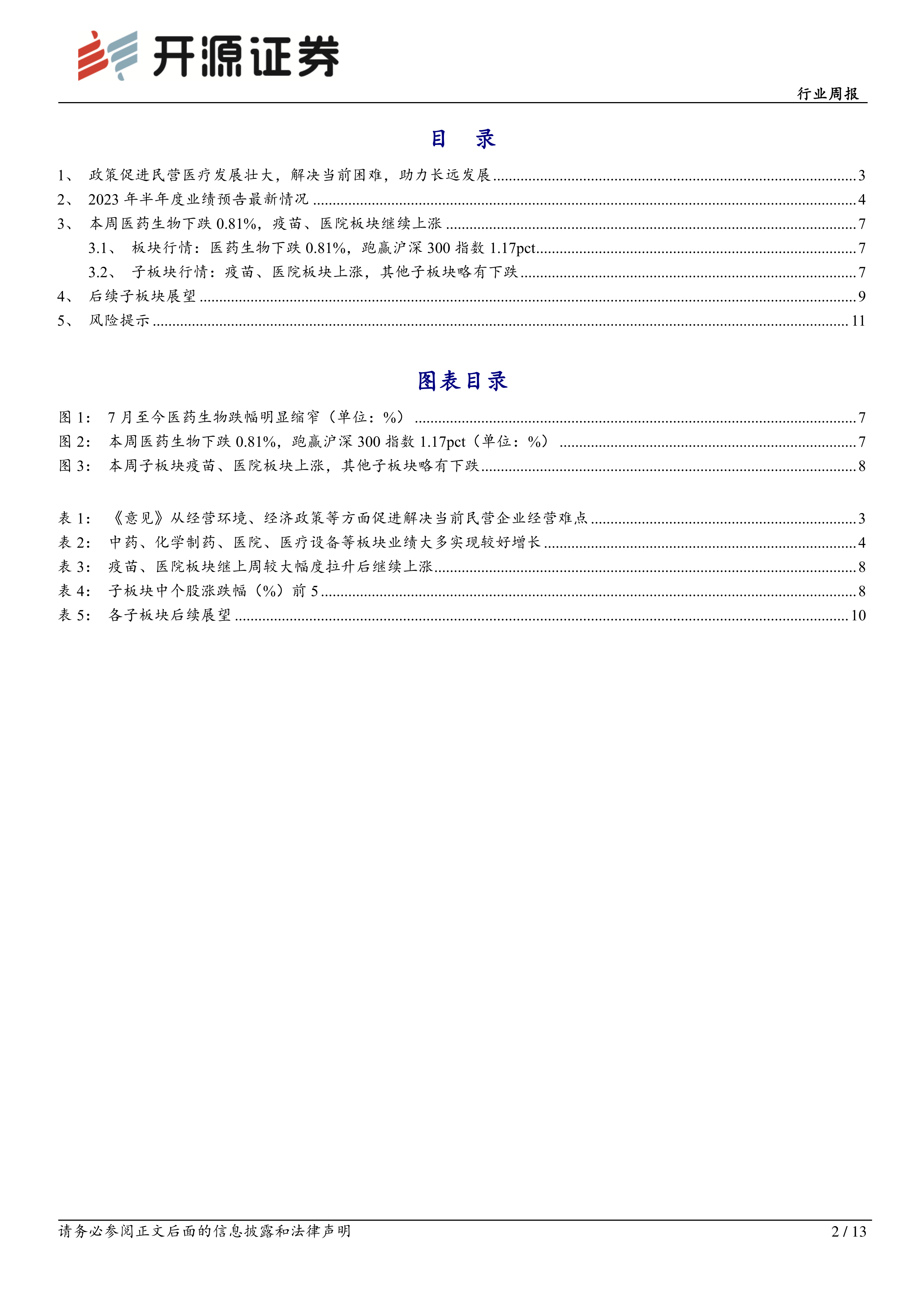 本报告的核心观点是:国家政策大力支持民营医疗发展,为医药生物行业带来积极影响,但仍需关注政策执行风险和行业黑天鹅事件。具体而言,报告分析了近期国家发布的《关于促进民营经济发展壮大的意见》对医药生物行业的影响,并结合2023年上半年业绩预告情况、行业走势以及各子板块的现状,对医药生物行业未来发展趋势进行了展望,并推荐和列举了部分受益标的。