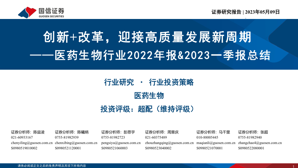 医药生物行业2022年报&2023一季报总结:创新+改革,迎接高质量发展新周期