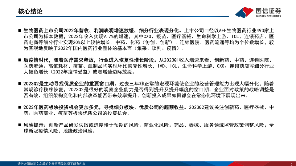 本报告的核心观点是:2022年中国医药生物行业营收和利润增速放缓,细分行业表现分化;2023年第一季度,行业进入恢复性增长阶段,但细分行业表现仍存在差异;2023年第二季度是观察企业经营能力和战略调整效果的重要窗口期;2023年医药板块投资机会多元化,建议关注创新药、医疗器械、中药、医药商业和疫苗等板块的优质公司。