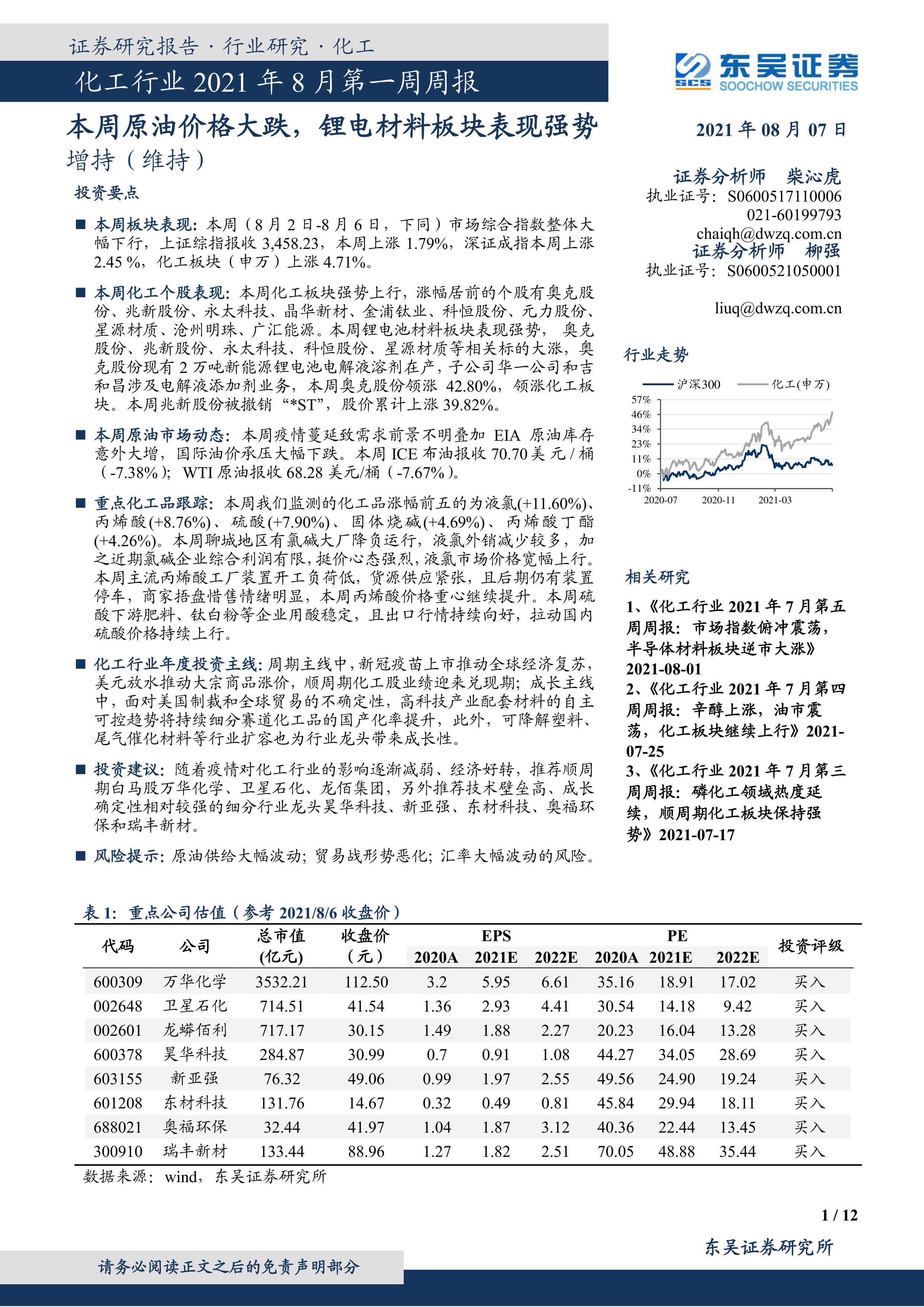 本报告对2021年8月第一周化工行业市场行情进行了全面分析。锂电材料板块的强势表现以及原油价格的大幅下跌是本周化工市场的主要特征。报告基于市场数据和行业分析,提出了年度投资主线和具体的投资建议,并对潜在风险进行了提示,为投资者提供参考。 报告中详细的数据和图表,以及对重点公司和化工产品的深入分析,有助于投资者更好地理解当前化工行业的市场动态和投资机会。 然而,投资者仍需注意报告中提到的风险因素,并结合自身情况进行独立判断。