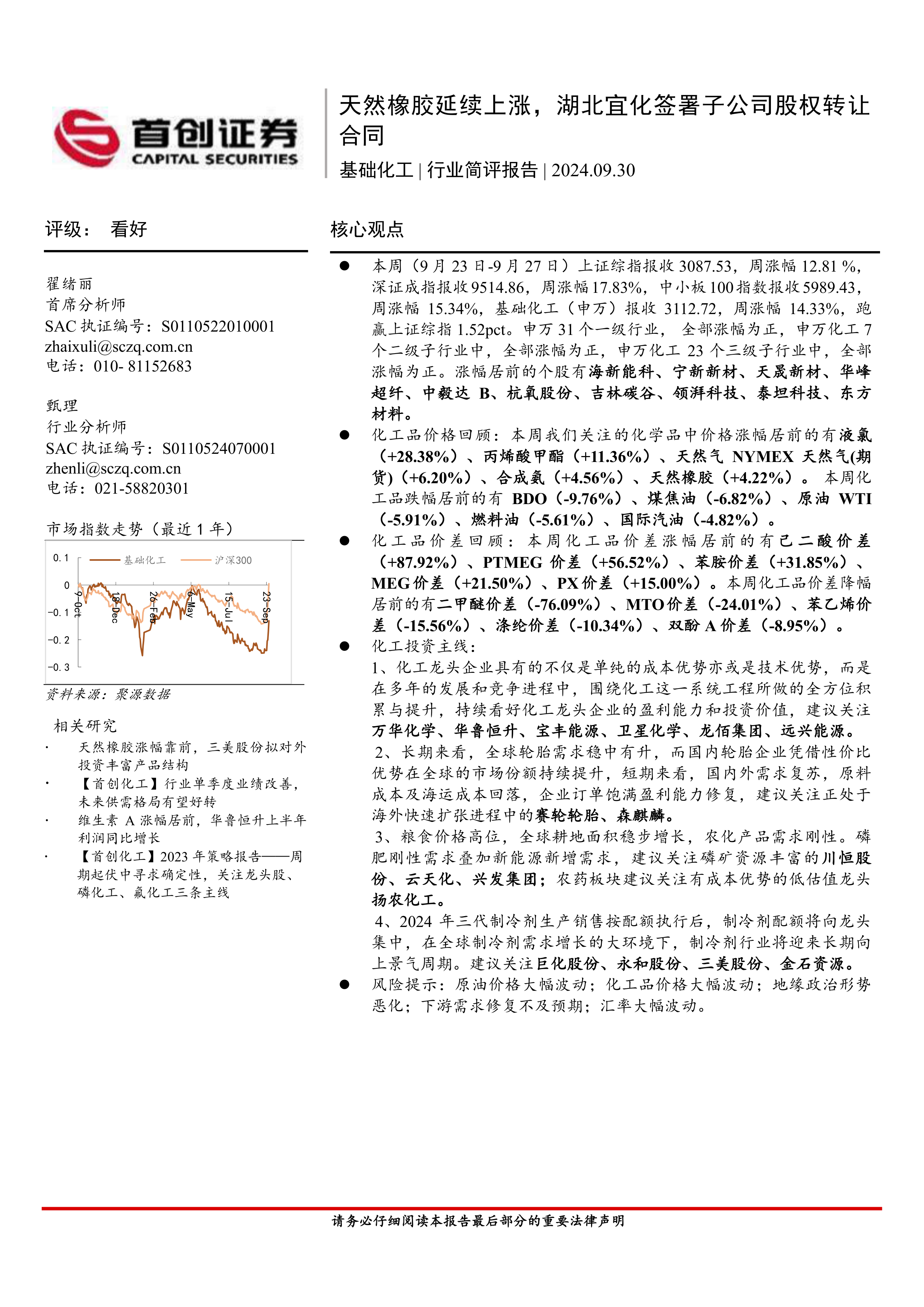 基础化工行业简评报告:天然橡胶延续上涨,湖北宜化签署子公司股权转让合同