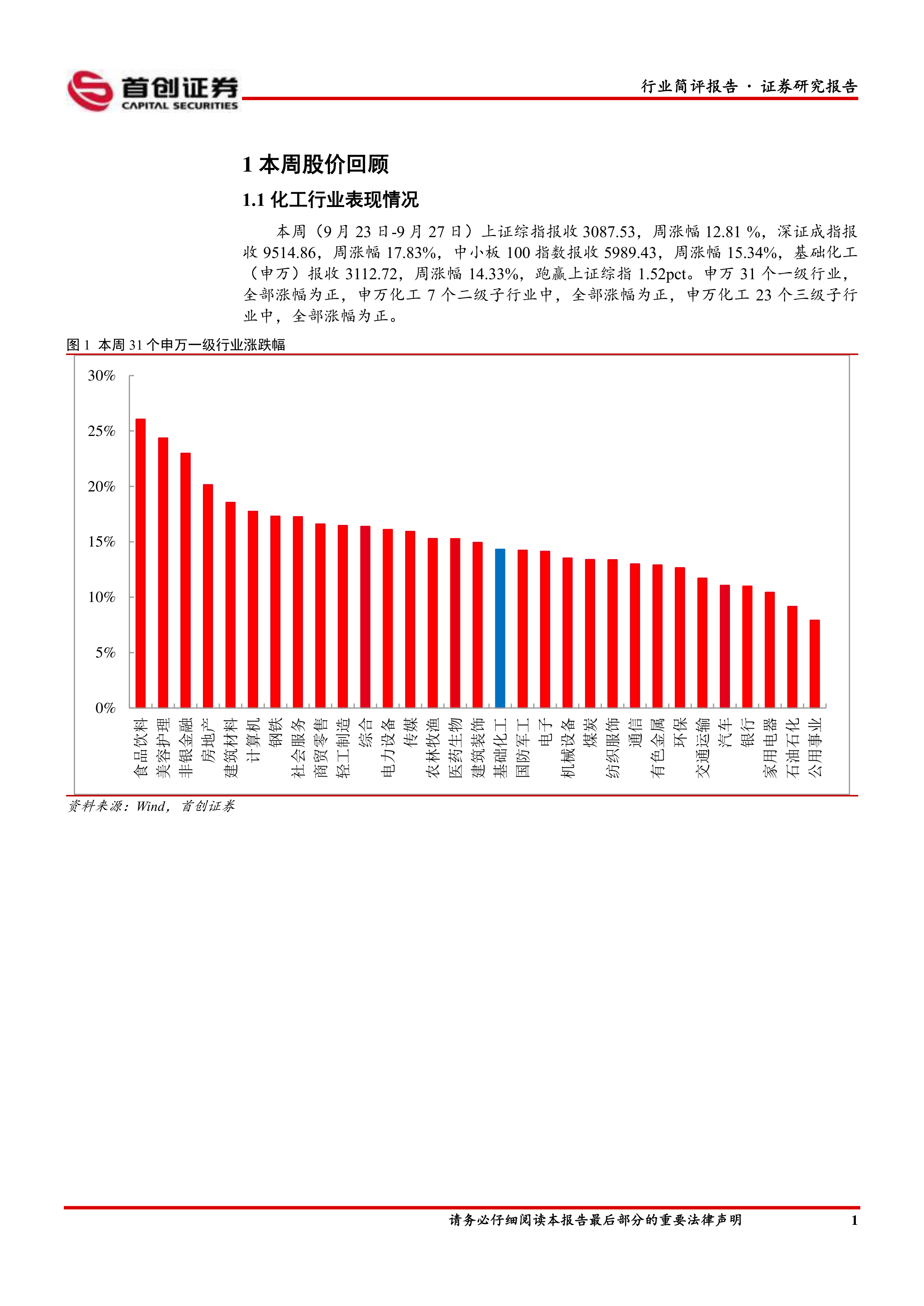 本周(9月23日-9月27日)上证综指报收3087.53,周涨幅12.81%,深证成指报收9514.86,周涨幅17.83%,中小板100指数报收5989.43,周涨幅15.34%,基础化工(申万)报收3112.72,周涨幅14.33%,跑赢上证综指1.52pct。申万31个一级行业,全部涨幅为正,申万化工7个二级子行业中,全部涨幅为正,申万化工23个三级子行业中,全部涨幅为正。涨幅居前的个股有海新能科、宁新新材、天晟新材、华峰超纤、中毅达B、杭氧股份、吉林碳谷、领湃科技、泰坦科技、东方材料。