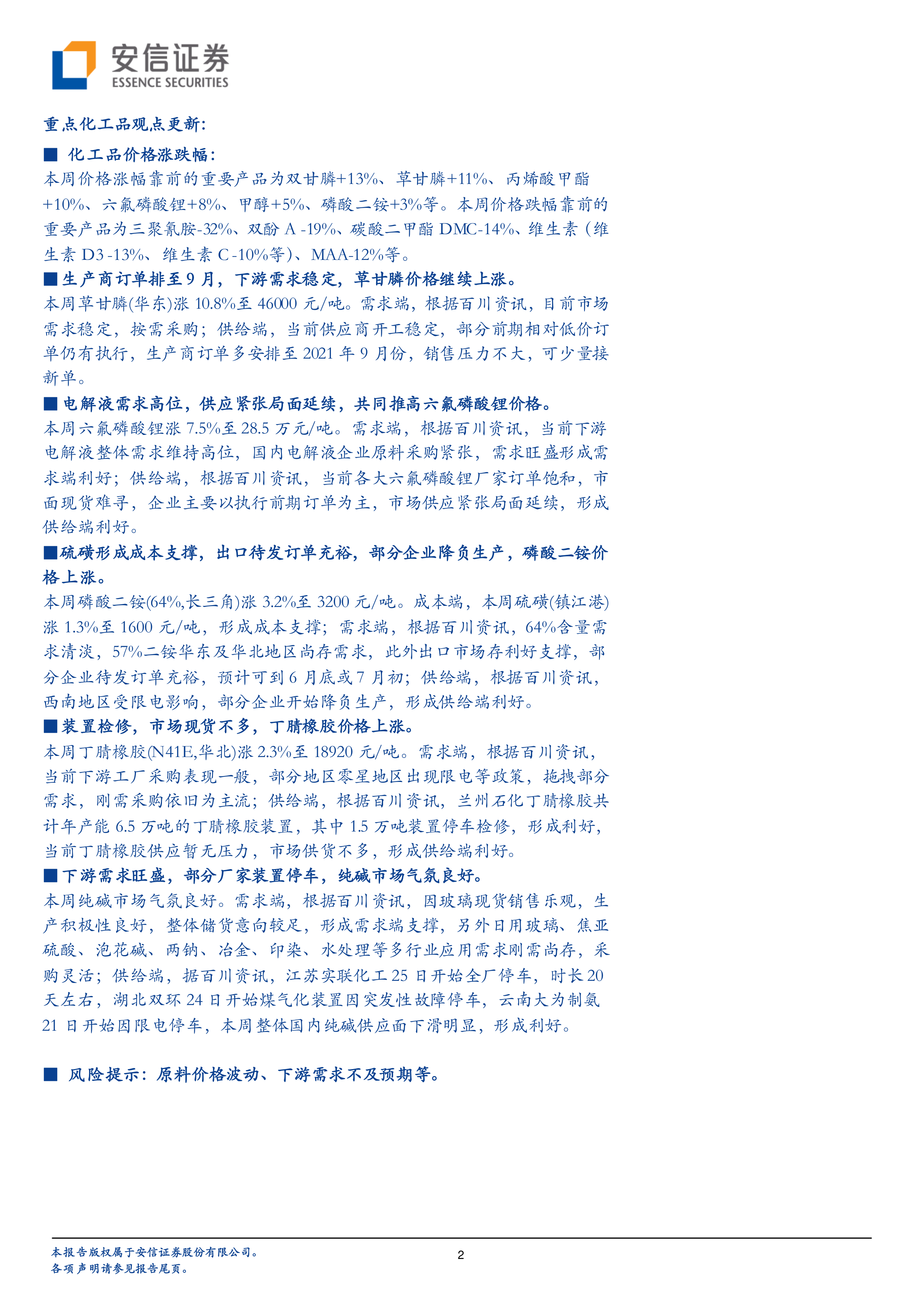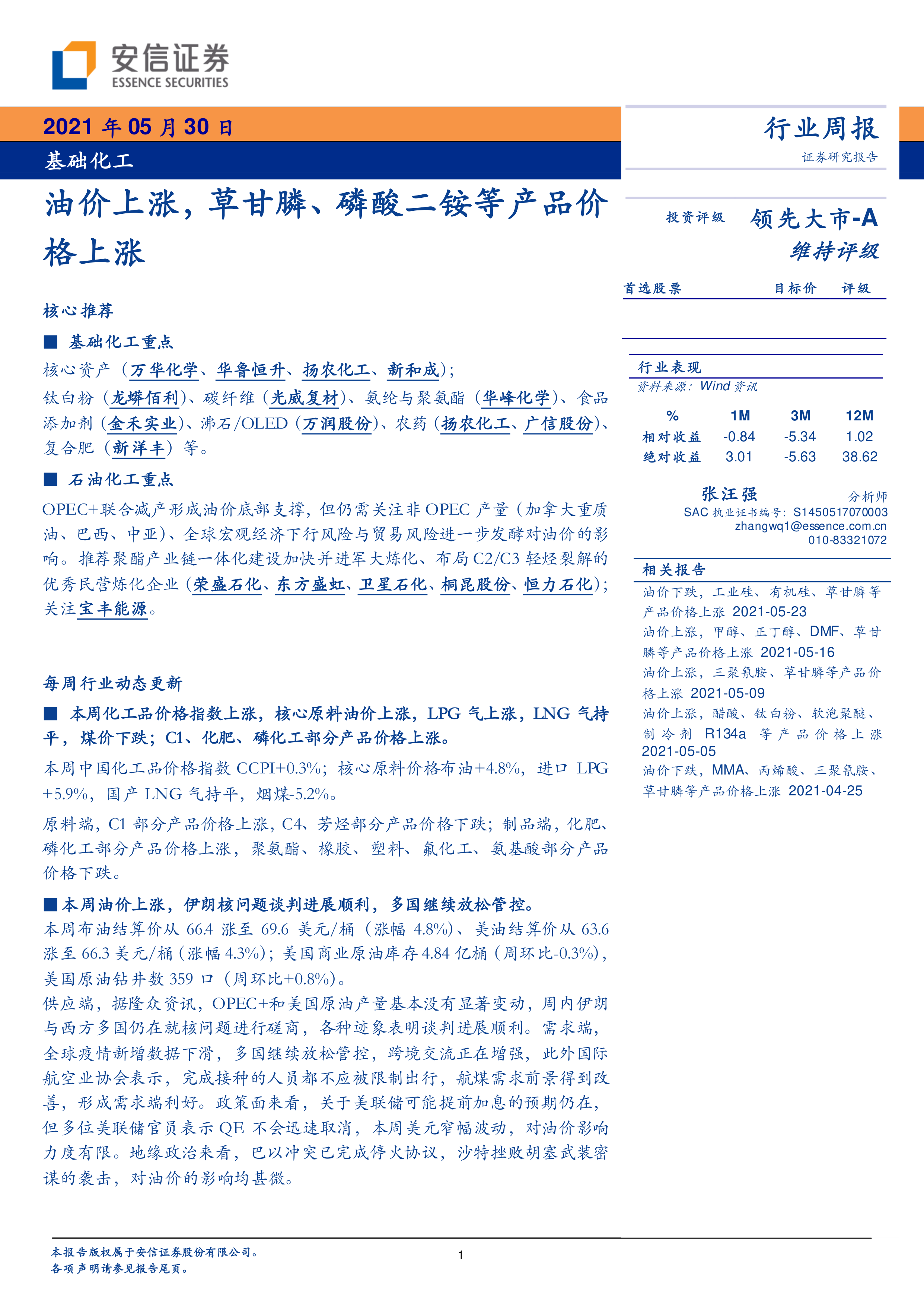 本报告的核心观点是:受OPEC+减产和全球经济复苏的推动,本周油价上涨,带动草甘膦、磷酸二铵等多种化工产品价格上涨。然而,部分产品如三聚氰胺、双酚A等价格下跌,市场存在一定波动。 整体来看,化工品市场呈现分化态势,部分产品供需紧张,价格上涨;部分产品则受下游需求或生产因素影响,价格下跌。 安信证券维持基础化工行业“领先大市-A”的投资评级。
