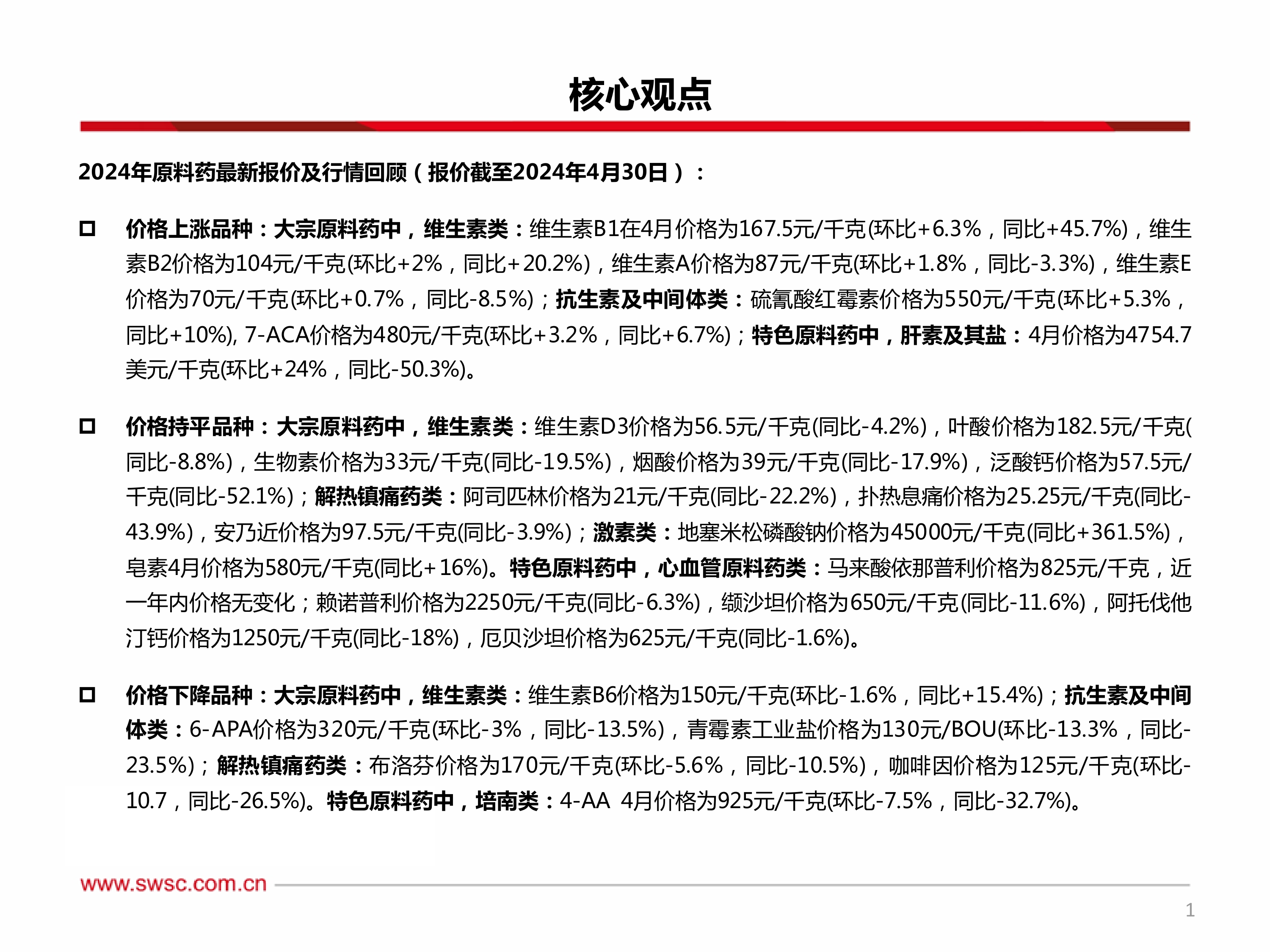 本报告的核心观点是:2024年1-4月原料药市场价格波动较大,部分品种价格上涨,部分品种价格下跌。维生素类、抗生素类和肝素类原料药价格波动值得关注。长期来看,特色原料药市场存在三个增长机会:一是“原料药+制剂”一体化战略,二是CDMO业务的产能释放,三是创新技术平台带来的高稀缺性、高壁垒产品。