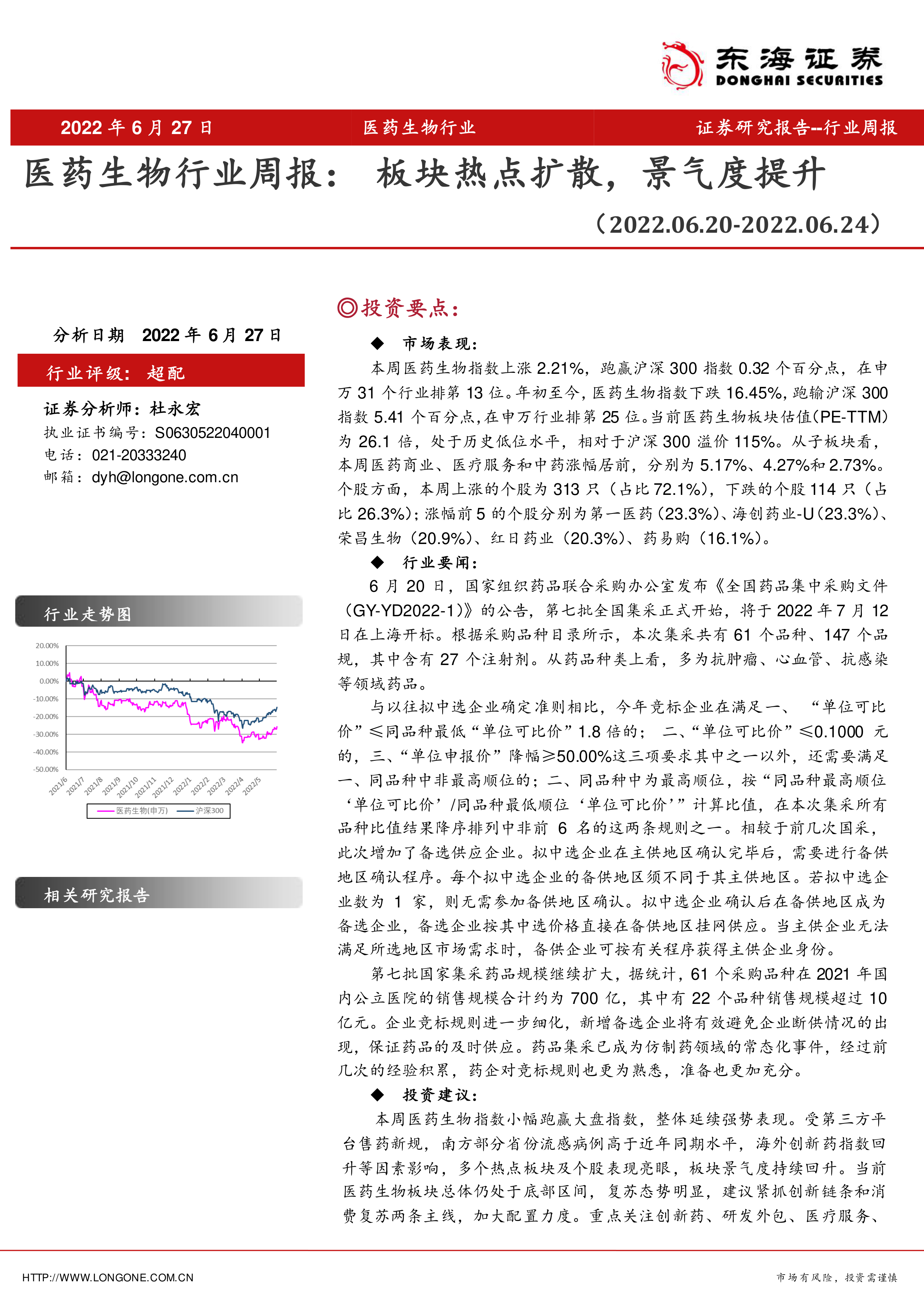 本报告的核心观点是:2022年6月20日至24日,医药生物板块整体表现强势,跑赢大盘,估值处于历史低位,具备较好投资价值。板块景气度提升主要受多重因素影响,包括第三方平台售药新规、南方部分省份流感病例增加以及海外创新药指数回升等。 建议投资者关注创新药、研发外包、医疗服务、连锁药店、二类疫苗、血制品和品牌中药等领域。 同时,报告也指出了政策风险、业绩风险和事件风险等潜在风险因素。
