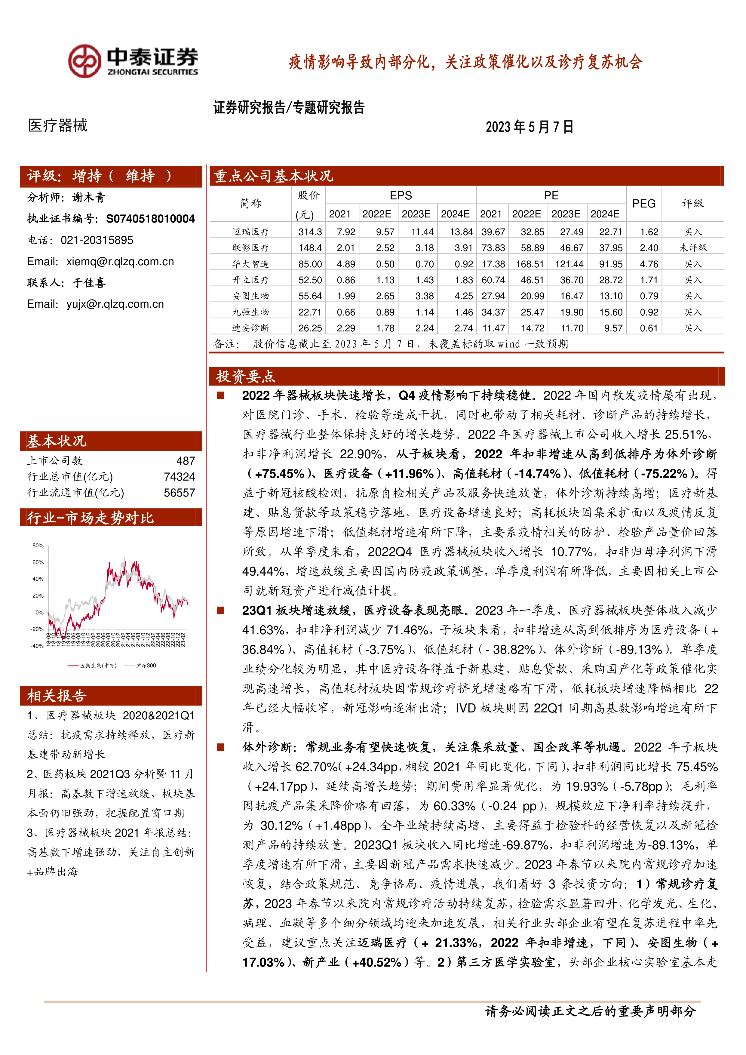 本报告基于对119家A股医疗器械上市公司2022年年报和2023年一季度报数据的分析,全面评估了中国医疗器械市场的现状和未来发展趋势。报告指出,2022年医疗器械板块整体增长迅速,但2023年一季度增速放缓,各子板块表现分化明显。这种分化主要源于新冠疫情相关产品需求的下降和常规医疗服务的恢复。报告建议投资者关注政策催化和常规诊疗复苏带来的投资机会,并根据不同子板块的具体情况选择投资标的,同时需注意相关风险。 报告中提供的财务数据和行业分析,为投资者进行投资决策提供了重要的参考依据。