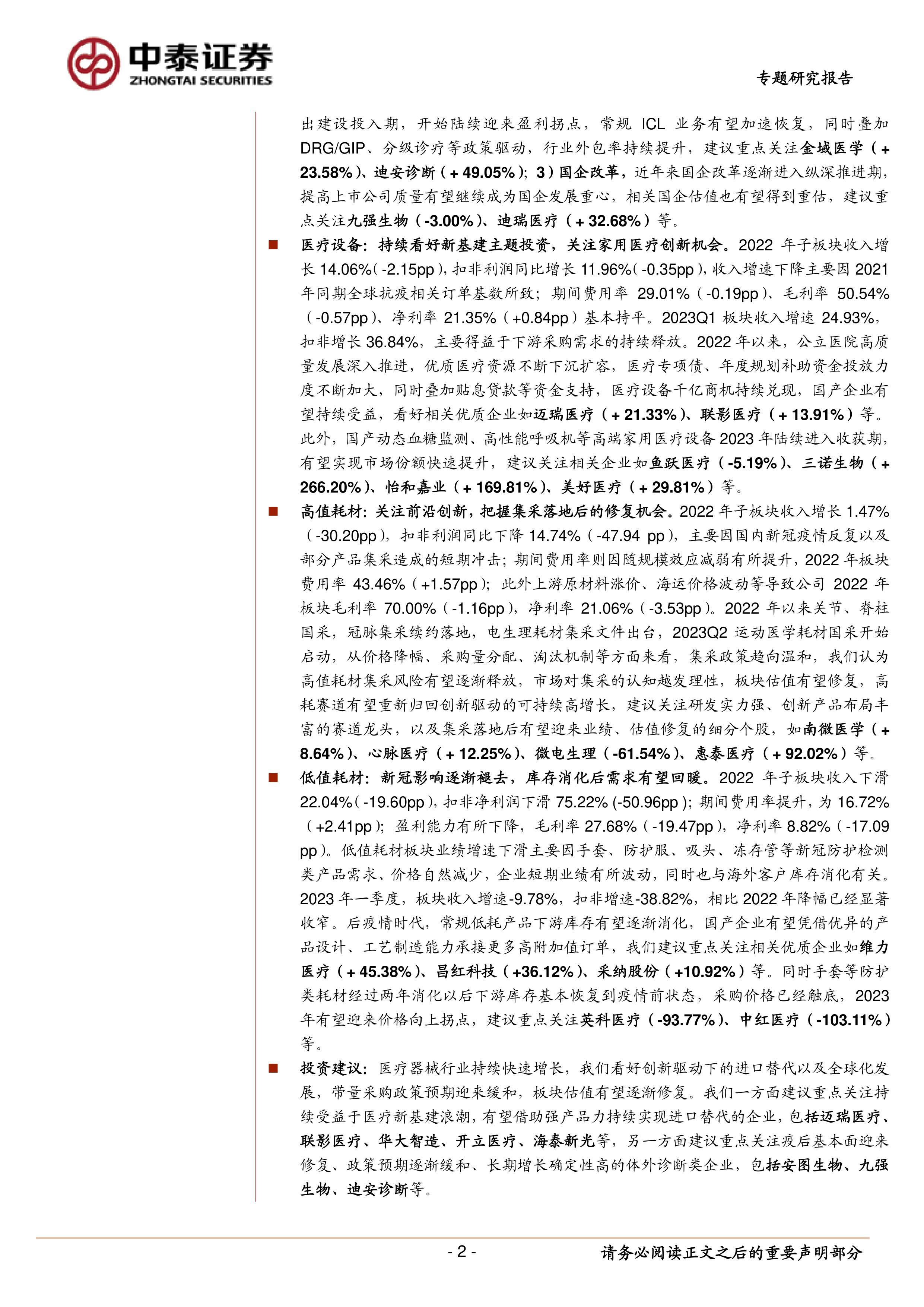本报告的核心观点是:2022年中国医疗器械板块整体保持快速增长,但2023年一季度增速放缓,呈现出明显的内部结构分化。这种分化主要源于新冠疫情相关产品需求的下降和常规医疗服务的恢复。报告建议投资者关注政策催化(如医疗新基建、贴息贷款、国产化采购)以及常规诊疗复苏带来的投资机会,并根据不同子板块的具体情况选择投资标的。