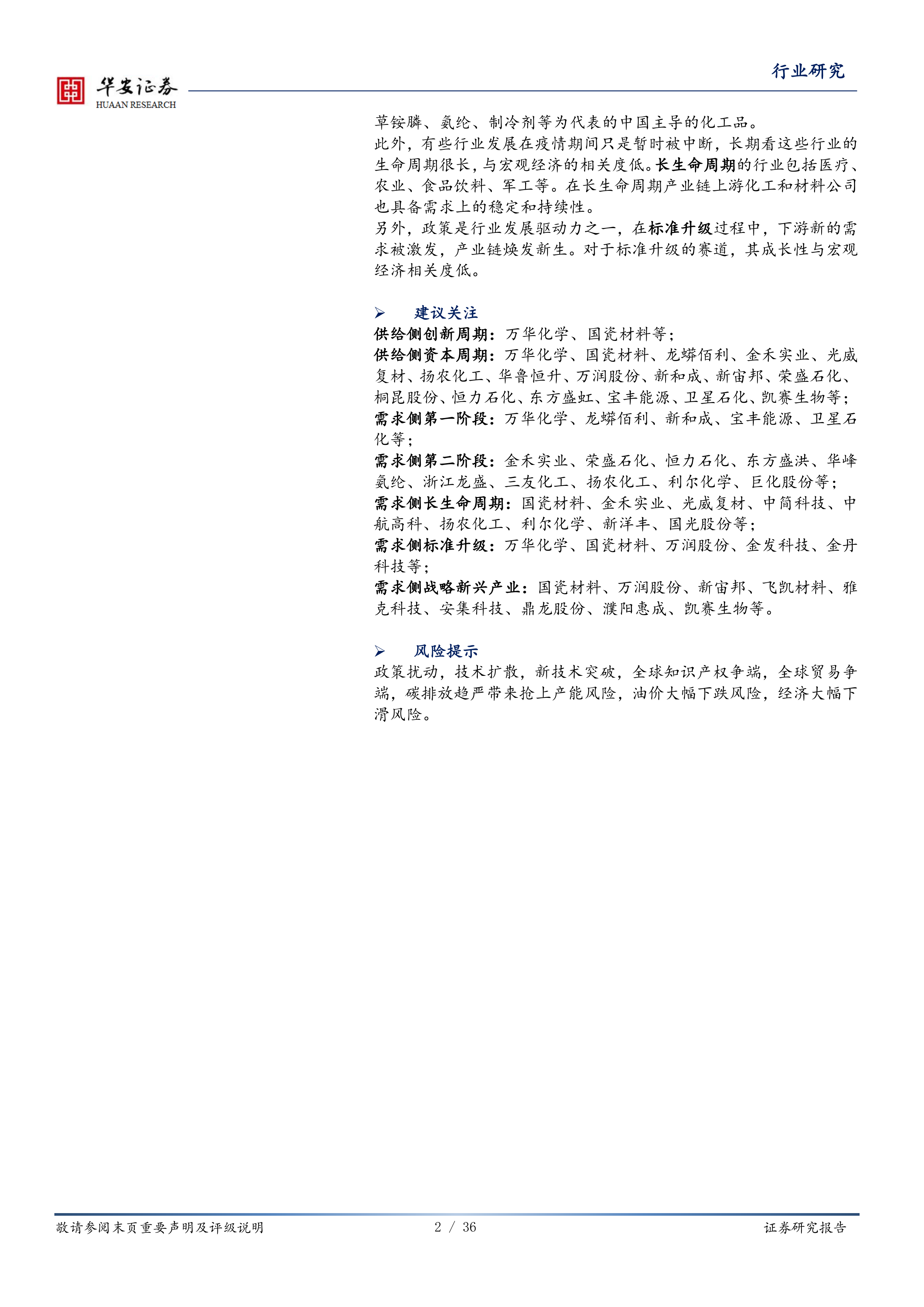 供给侧资本周期:万华化学、国瓷材料、龙蟒佰利、金禾实业、光威复材、扬农化工、华鲁恒升、万润股份、新和成、新宙邦、荣盛石化、桐昆股份、恒力石化、东方盛虹、宝丰能源、卫星石化、凯赛生物等;