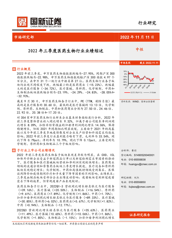 本报告基于国新证券市场研究部2022年11月11日发布的《2022年三季度医药生物行业业绩综述》,对2022年前三季度中国医药生物行业整体表现及各子行业业绩进行数据分析和总结。报告核心观点如下: