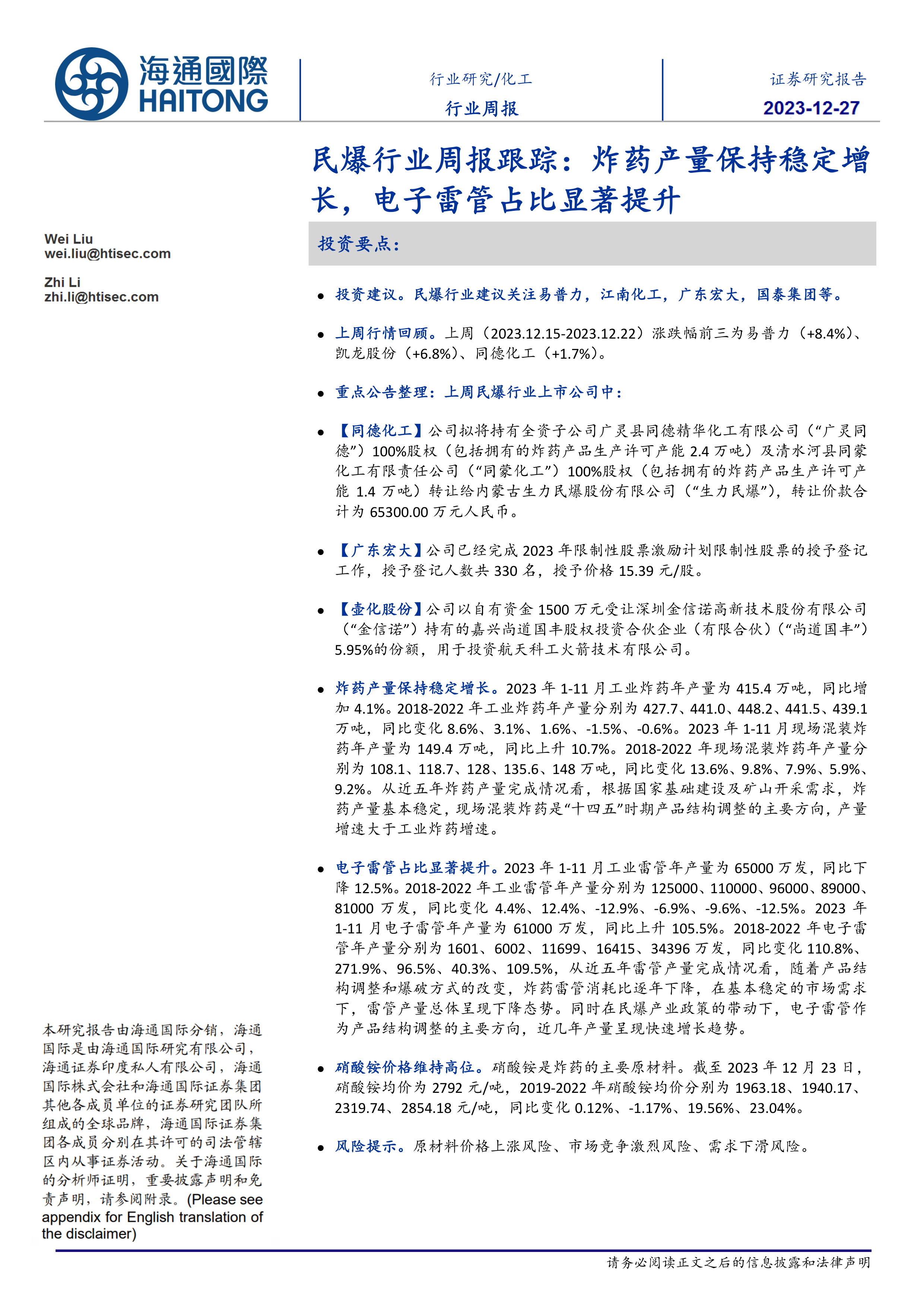 上周行情回顾。上周(2023.12.15-2023.12.22)涨跌幅前三为易普力(+8.4%)、凯龙股份(+6.8%)、同德化工(+1.7%)。