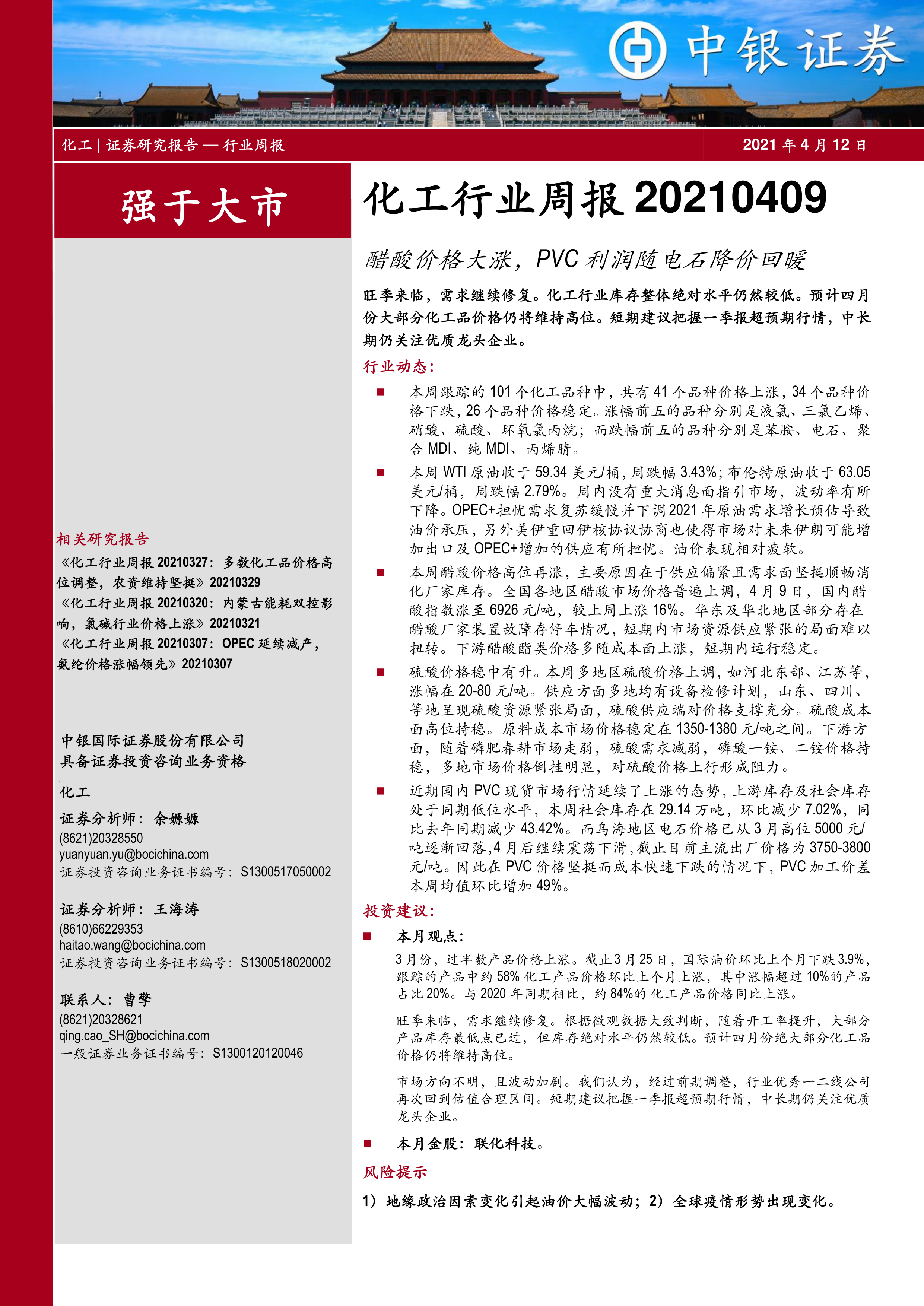 本报告对2021年4月化工行业周报进行了数据分析和解读。报告指出,化工行业整体表现强于大市,多数化工产品价格维持高位,但市场波动加剧,方向不明。重点关注了醋酸、硫酸、三氯乙烯和PVC等产品的价格变化及原因分析。同时,报告还对本周化工行业重要新闻事件进行了总结,并推荐了联化科技作为本月金股。短期建议关注一季报超预期行情,中长期仍需关注优质龙头企业。 投资者需注意地缘政治因素变化和全球疫情形势变化带来的风险。