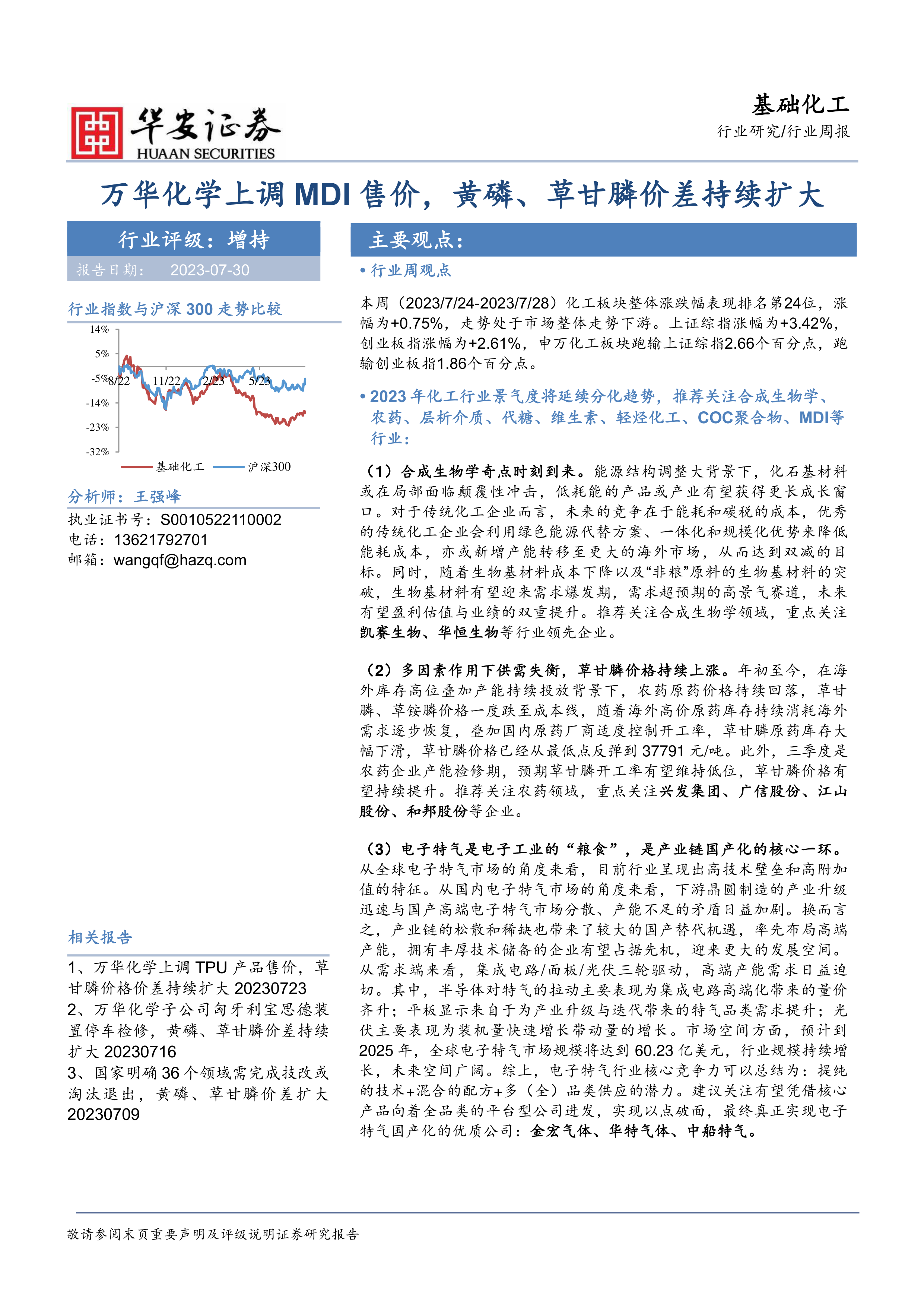 基础化工行业周报:万华化学上调MDI售价,黄磷、草甘膦价差持续扩大