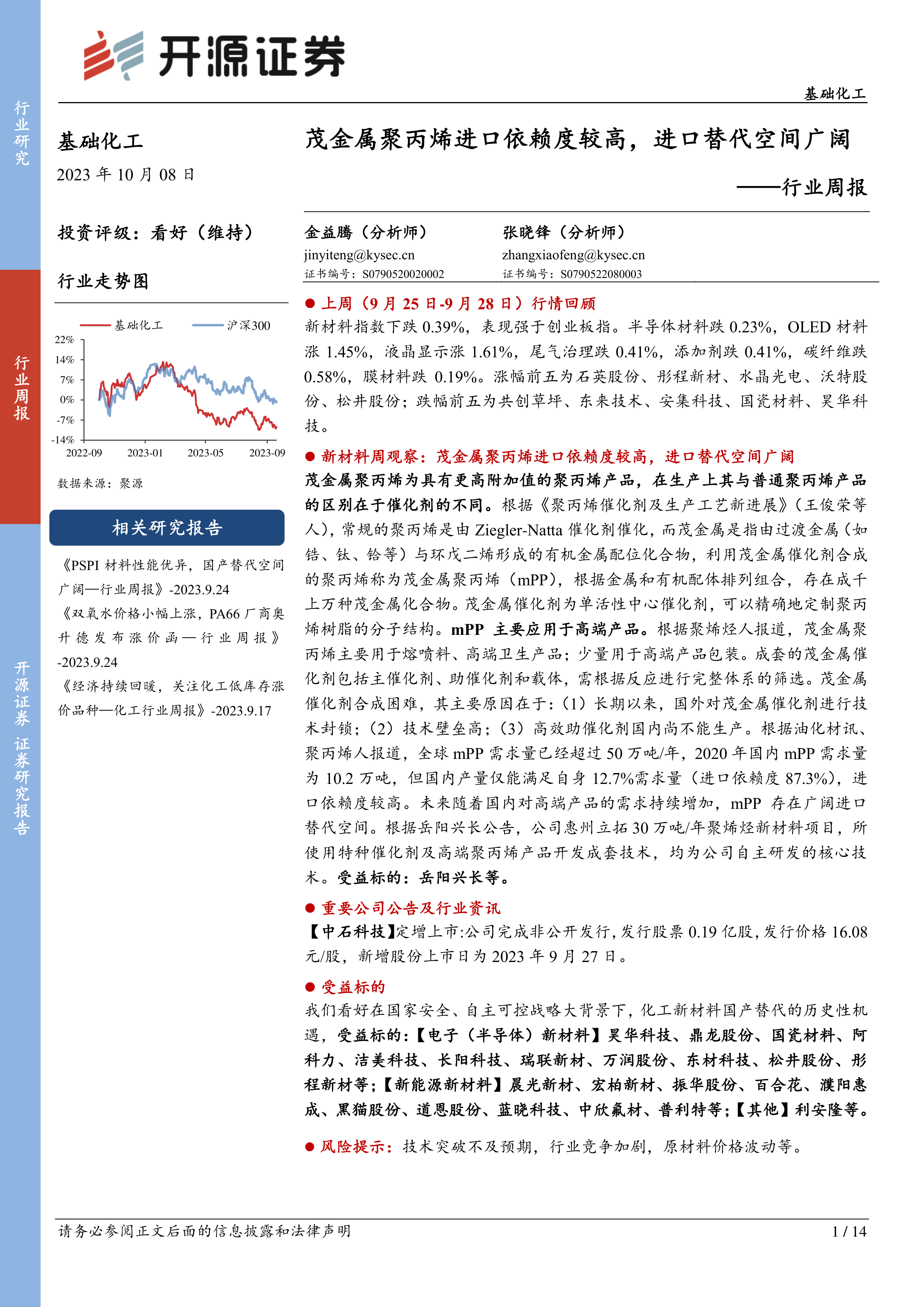 基础化工行业周报:茂金属聚丙烯进口依赖度较高,进口替代空间广阔