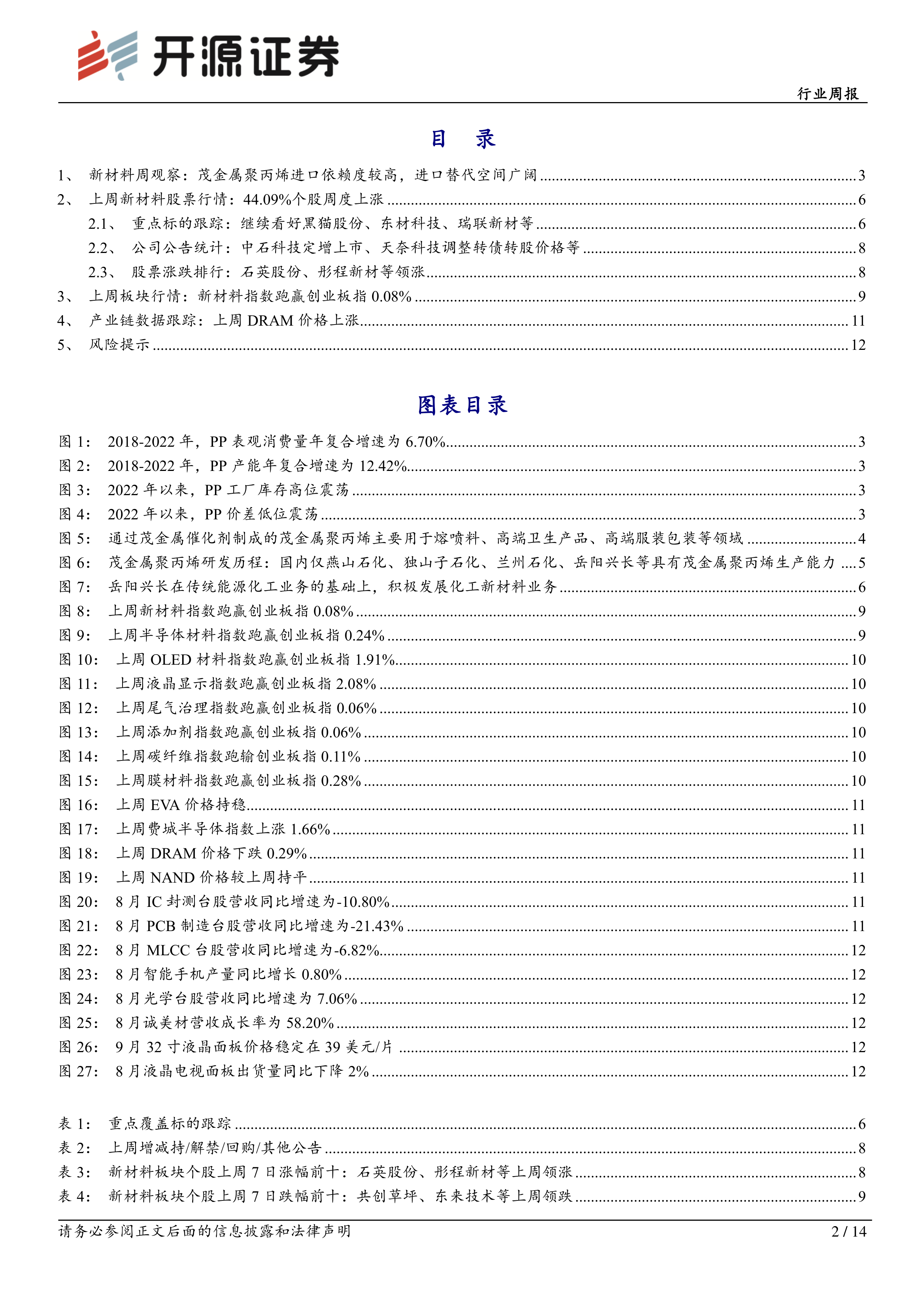 上周(9月25日-9月28日),新材料指数下跌0.39%,表现强于创业板指。半导体材料、OLED材料、液晶显示材料等板块涨跌幅度不一。石英股份、彤程新材等个股领涨,共创草坪、东来技术等个股领跌。