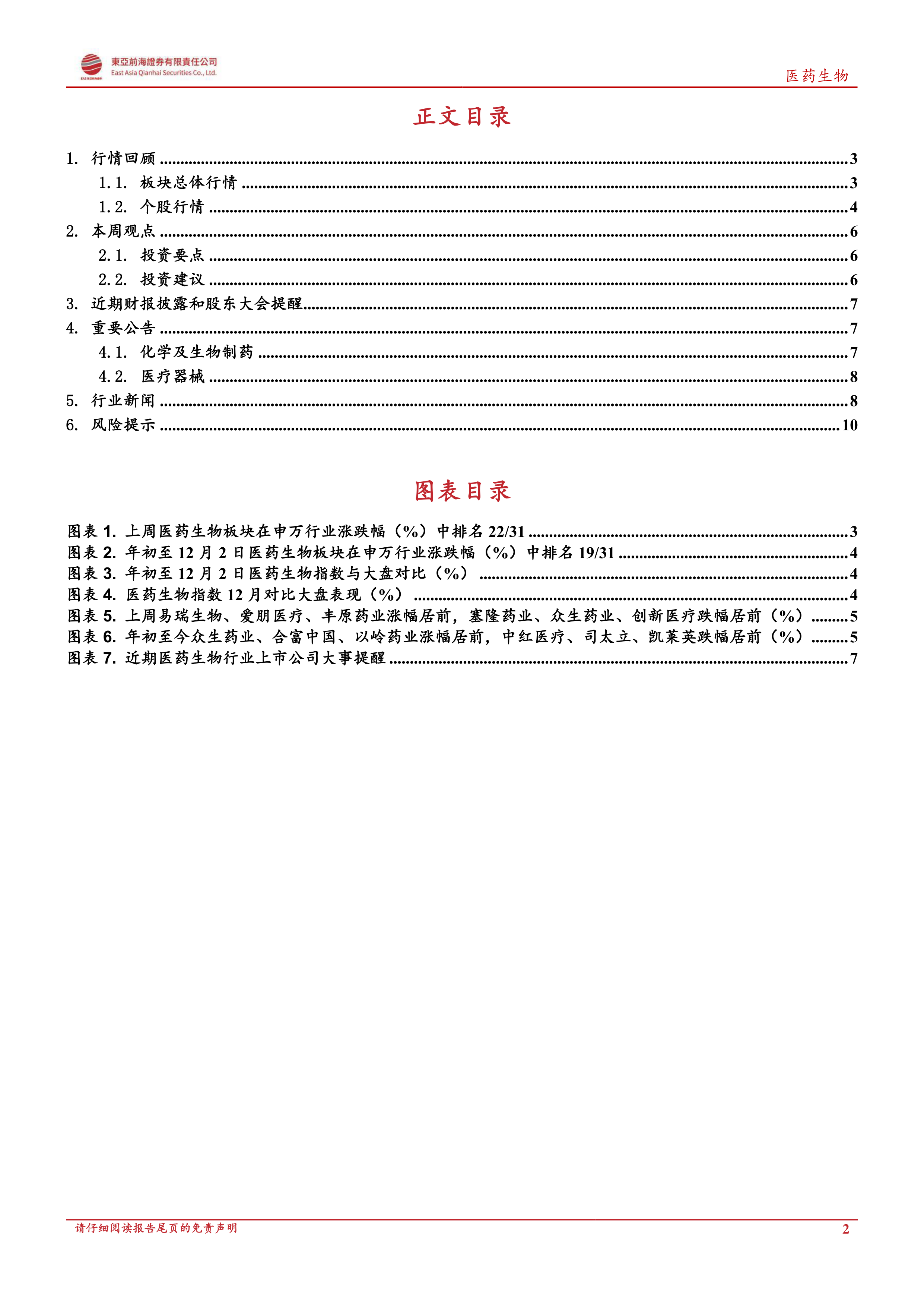 报告首先回顾了上周(11月28日至12月2日)医药生物板块的整体行情。申万医药生物板块上涨1.18%,跑输沪深300指数1.34个百分点,在31个一级子行业中排名第22位。医药商业板块涨幅最大,达6.89%。年初至今,医药生物板块下跌18.22%,跑赢沪深300指数4.42个百分点,在31个一级子行业中排名第19位。报告还分析了部分个股的上涨和下跌情况,例如易瑞生物、爱朋医疗、丰原药业涨幅居前,而塞隆药业、众生药业、创新医疗跌幅居前。