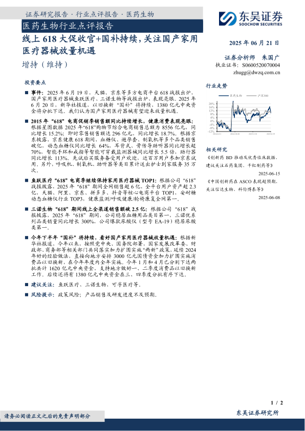 事件:2025年6月19日,天猫、京东等多方电商平台618战报出炉,国产家用医疗器械鱼跃医疗、三诺生物等战报出炉,表现亮眼。2025年6月20日,新华社报道,以旧换新“国补”将持续,1380亿元中央资金将分批下达。我们认为国产家用医疗器械有望迎来放量机遇。