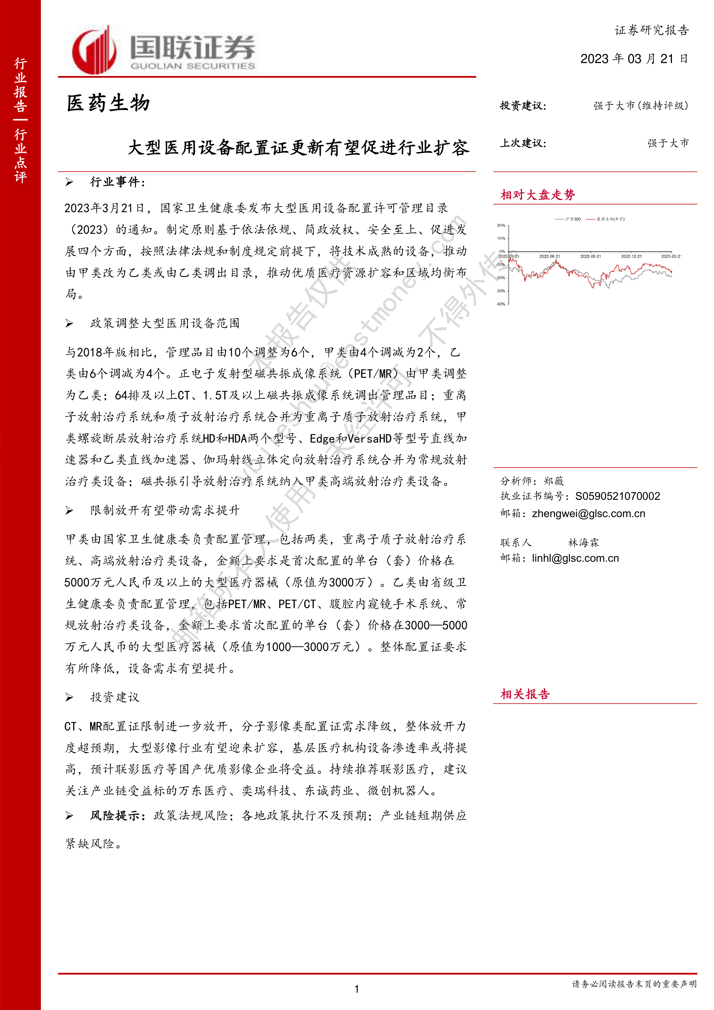 本报告分析了国家卫生健康委发布的《大型医用设备配置许可管理目录(2023)》对大型医用设备行业的影响。该目录的调整降低了部分大型医用设备的配置门槛,这将促进医疗资源扩容和区域均衡布局,并带动相关设备的需求提升。报告建议投资者关注受益于政策调整的国产优质影像企业和产业链受益标的,同时需注意潜在的政策风险和市场风险。 报告中给出的投资建议为“强于大市”,并推荐联影医疗以及其他相关企业。 投资者应根据自身情况,结合报告内容进行独立判断,并承担相应的投资风险。
