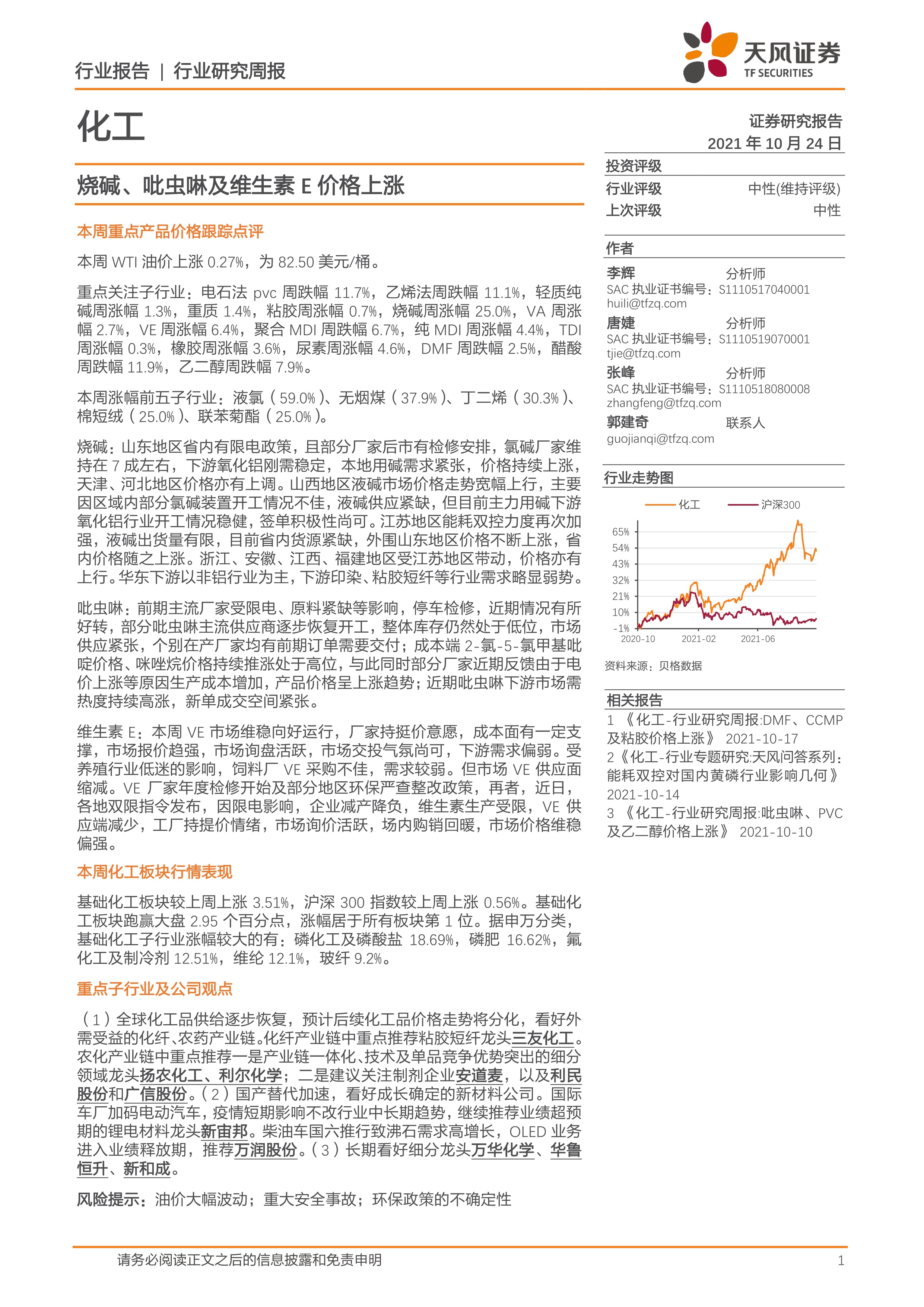 本报告的核心观点是:2021年10月24日,化工行业整体表现强劲,基础化工板块跑赢大盘,部分化工产品价格大幅上涨,主要受限电政策、原料紧缺以及下游需求等因素影响。报告重点关注烧碱、吡虫啉和维生素E价格上涨,并对化纤、农药、聚氨酯、塑料、纯碱、氯碱、橡胶、钛白粉等子行业及重点公司进行了分析,给出投资建议。