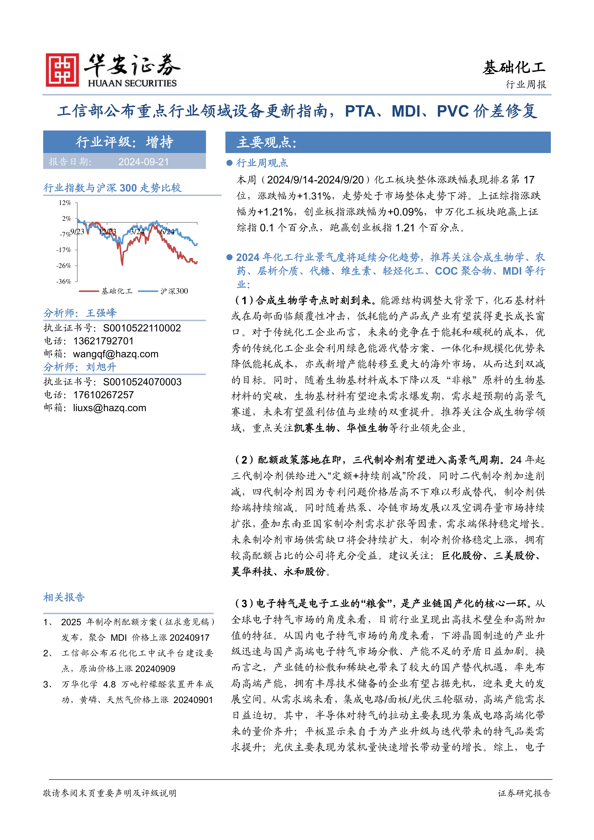 基础化工行业周报:工信部公布重点行业领域设备更新指南,PTA、MDI、PVC价差修复