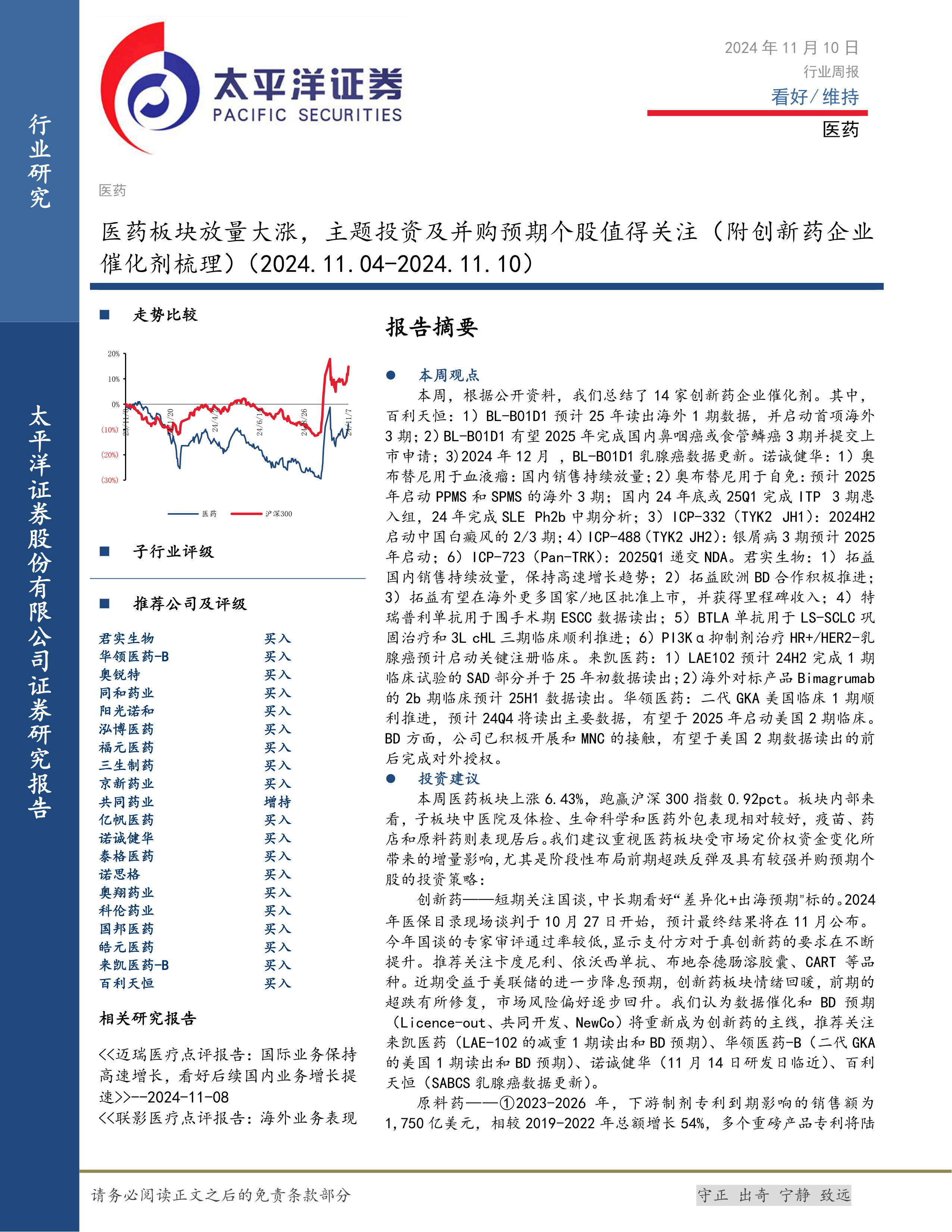 医药行业周报:医药板块放量大涨,主题投资及并购预期个股值得关注(附创新药企业催化剂梳理)