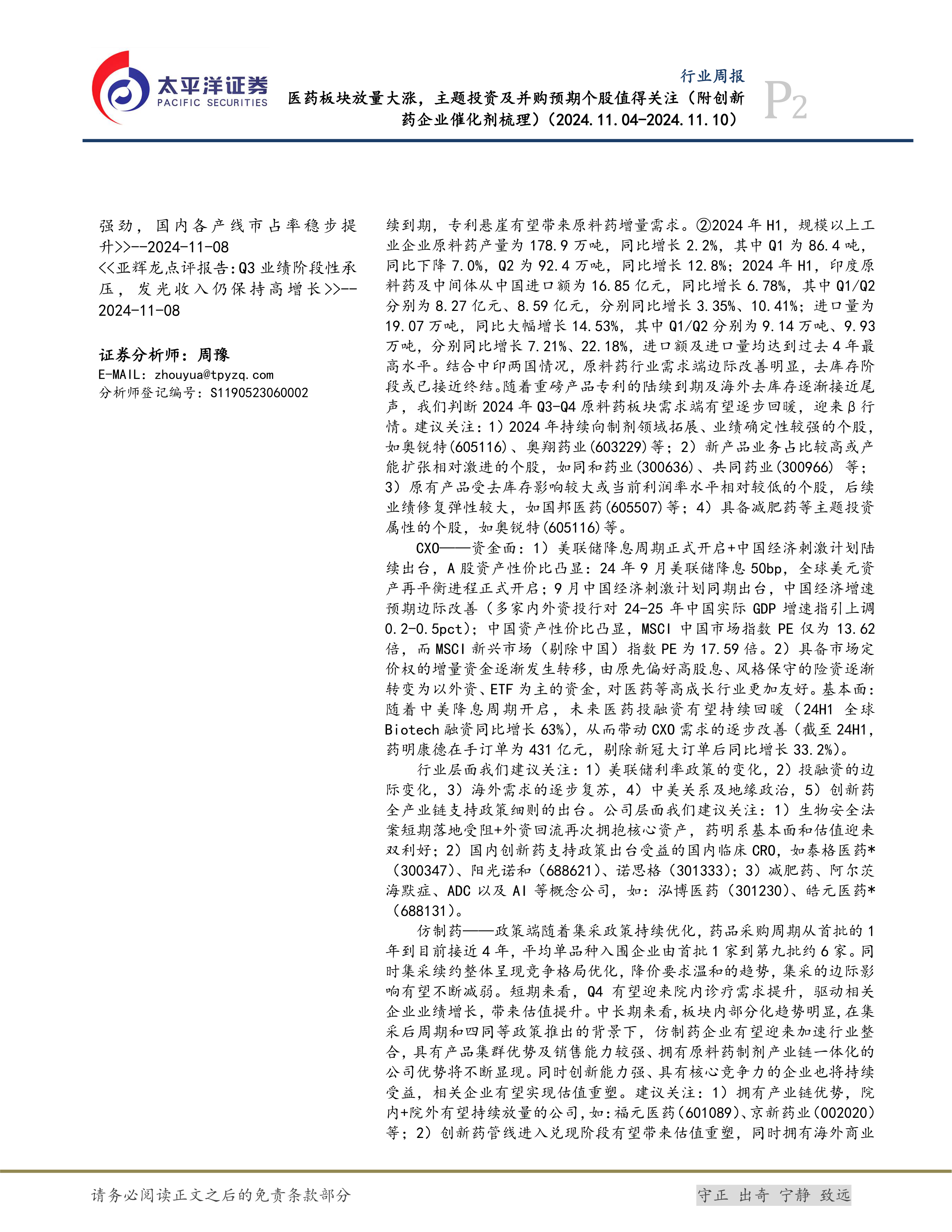 本报告对医药板块的近期表现进行了分析,并对未来投资策略提出了建议。 报告指出,医药板块本周强势上涨,主要受益于美联储降息预期和中国经济刺激计划,以及市场对创新药和CXO板块的积极预期。 未来投资应关注创新药的医保谈判结果和“差异化+出海”策略,原料药板块的去库存周期结束后的回暖,CXO板块的投融资环境改善,以及仿制药板块的行业整合机会。 同时,投资者需关注报告中列出的各种风险因素。