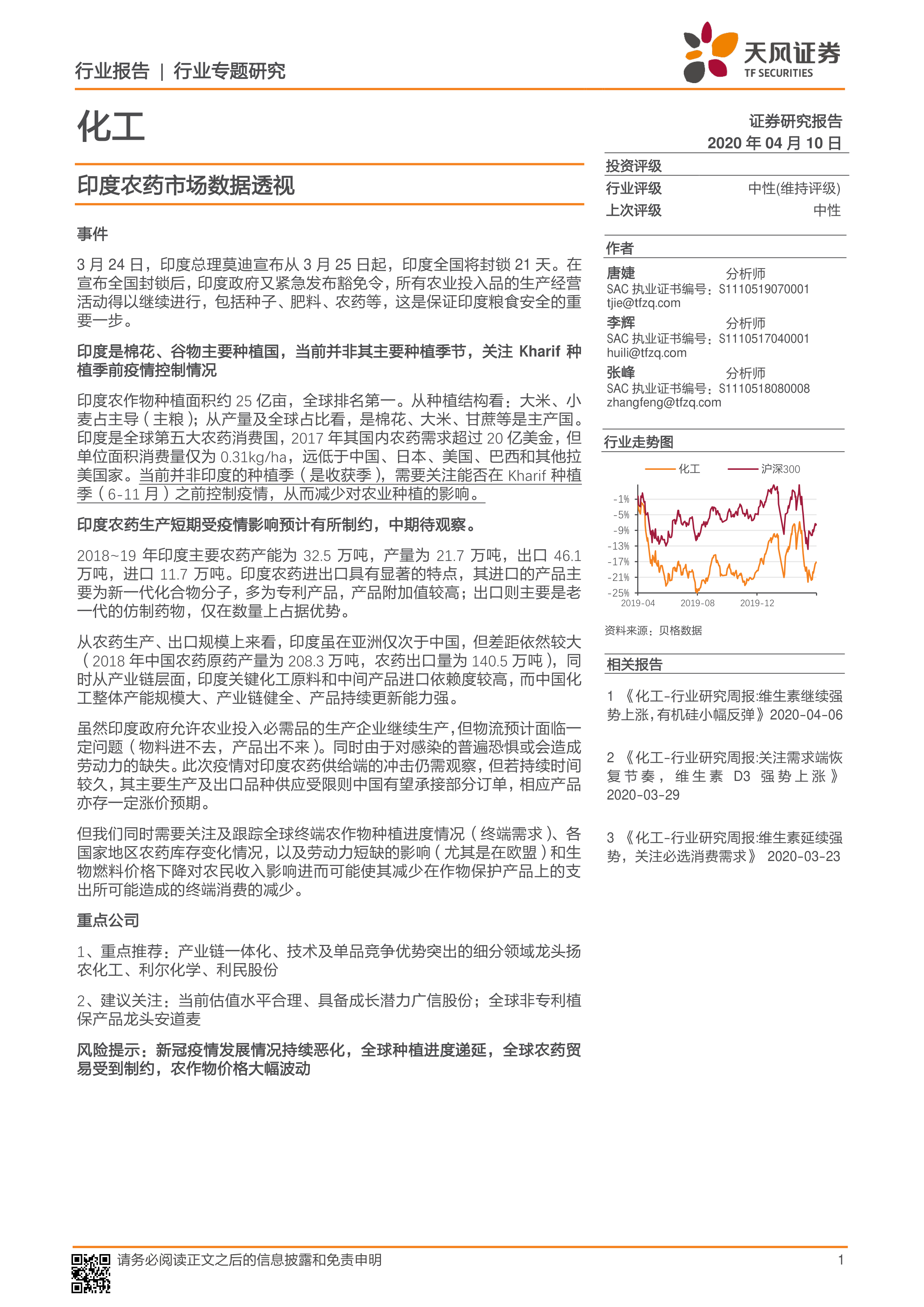 本报告分析了印度农药市场的现状、发展趋势及面临的挑战。印度农药市场规模巨大,但单位面积用药量低,存在提升空间。新冠疫情对印度农药市场短期供给端造成冲击,但长期影响有待观察。中国农药企业凭借其产业链优势和技术实力,有望在后疫情时代抓住机遇,拓展印度市场。 需要持续关注全球农作物种植进度、农药库存变化以及劳动力短缺等因素对印度农药市场的影响。 同时,投资者也需注意相关风险,例如疫情发展恶化、全球农药贸易受限以及农作物价格大幅波动等。