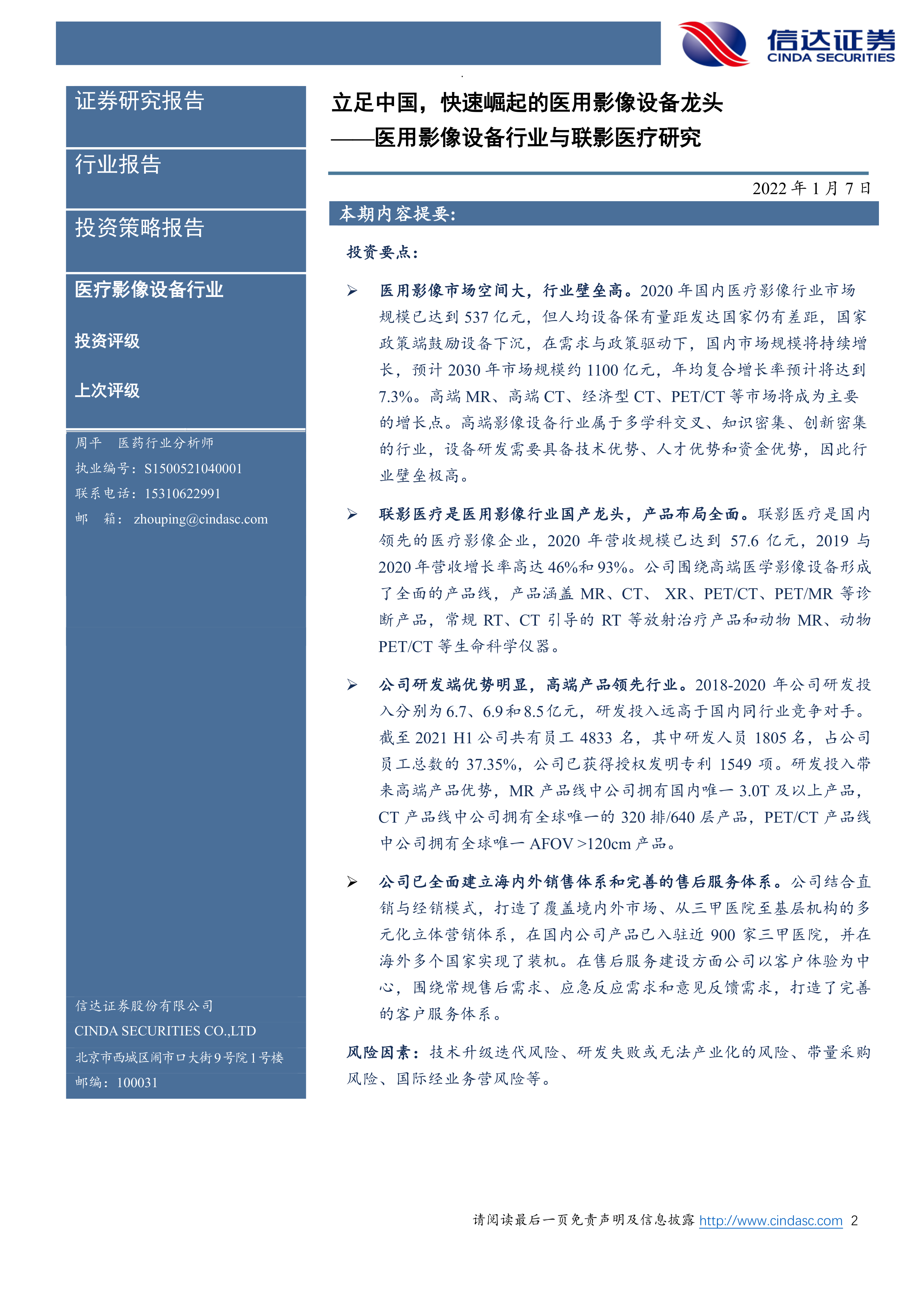 本报告对中国医用影像设备行业和联影医疗进行了深入分析。报告指出,中国医用影像设备市场潜力巨大,联影医疗凭借其全面的产品布局、强大的研发能力、完善的销售和售后服务体系以及产学研医融合的优势,在行业竞争中占据领先地位。虽然公司面临一些风险,但其未来发展前景依然广阔。 报告中大量的数据和图表支撑了上述结论,为投资者提供了有价值的参考信息。