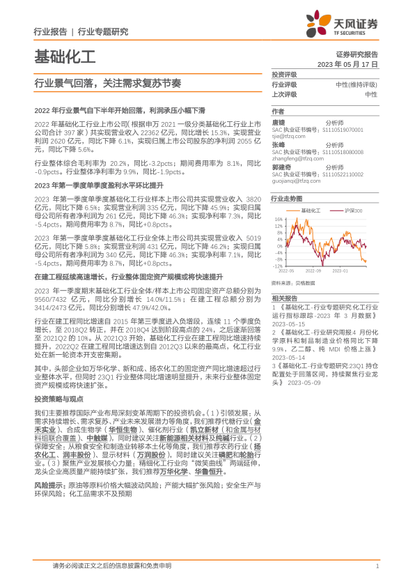 基础化工行业专题研究:行业景气回落,关注需求复苏节奏