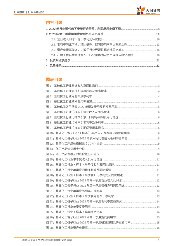 本报告对2022年和2023年第一季度基础化工行业进行了全面的数据分析,揭示了行业景气度回落、利润承压、但盈利水平环比提升的现状。 在建工程的持续高速增长预示着行业未来将迎来快速扩张。 报告最后给出了投资建议,并提示了潜在的投资风险,为投资者提供了重要的参考信息。 报告数据翔实,分析深入,为理解基础化工行业现状和未来发展趋势提供了 valuable insights。