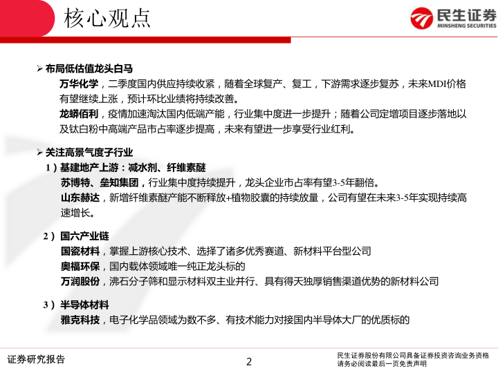 本报告的核心观点是:在基础化工行业,建议布局低估值龙头企业,同时关注高景气度子行业带来的投资机会。报告重点推荐了万华化学和龙蟒佰利作为低估值龙头,并分别从基建地产上游、国六产业链和半导体材料三个高景气子行业,推荐了多个具有增长潜力的公司。