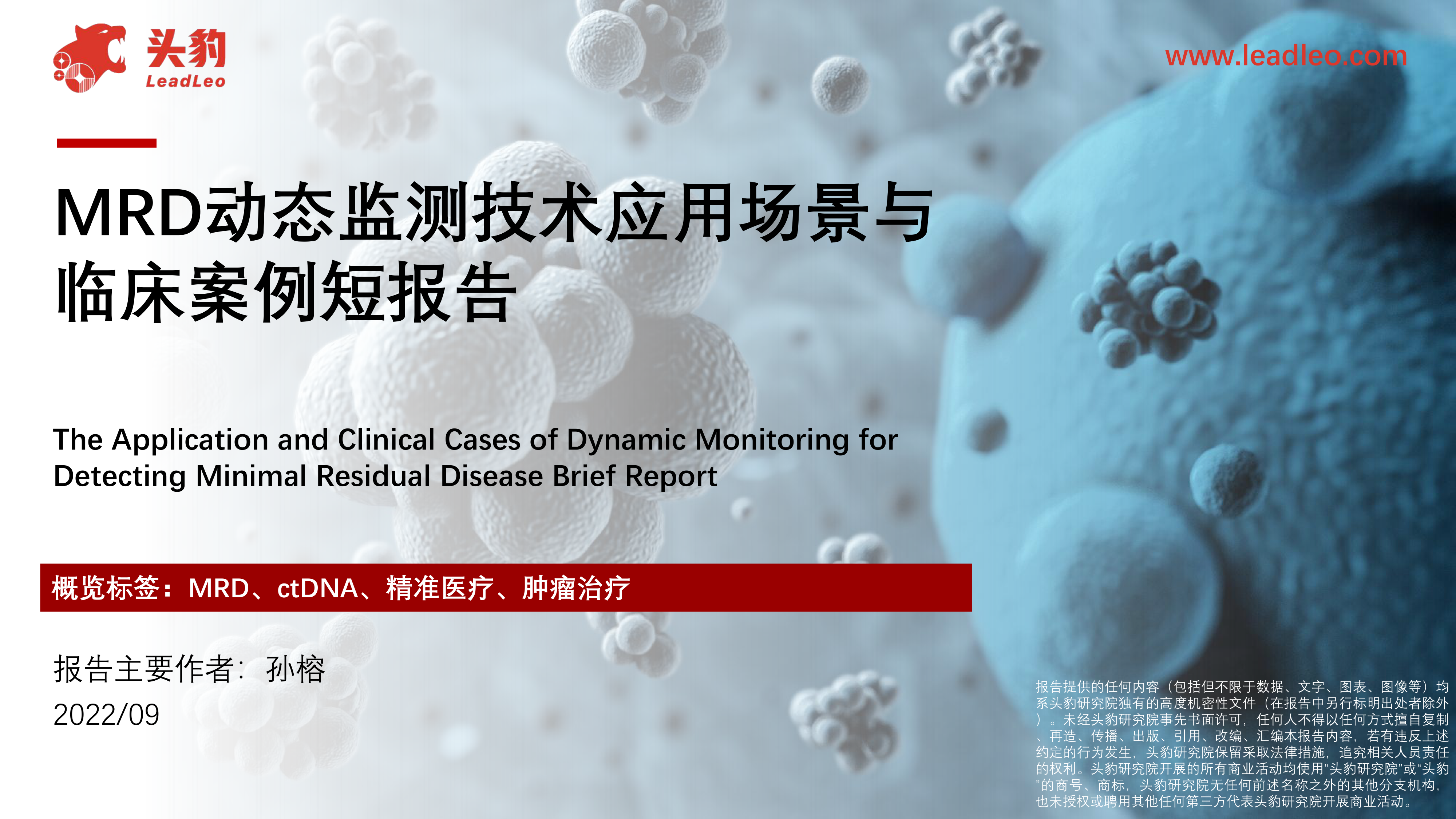 本报告的核心观点是:传统的肿瘤检测方法如影像学等存在局限性,难以满足精准医疗的需求。而MRD(微小残留病灶)动态监测技术作为一种新兴技术,凭借其高灵敏度和特异性,能够贯穿肿瘤精准诊疗的全过程,在辅助治疗决策、预后评估、术后复发监测等多个应用场景中发挥重要作用,未来发展潜力巨大。 报告通过分析MRD动态监测技术与传统检测技术的差异,并结合临床案例,阐述了MRD技术在肿瘤全生命周期管理中的应用价值,并展望了其未来发展趋势。