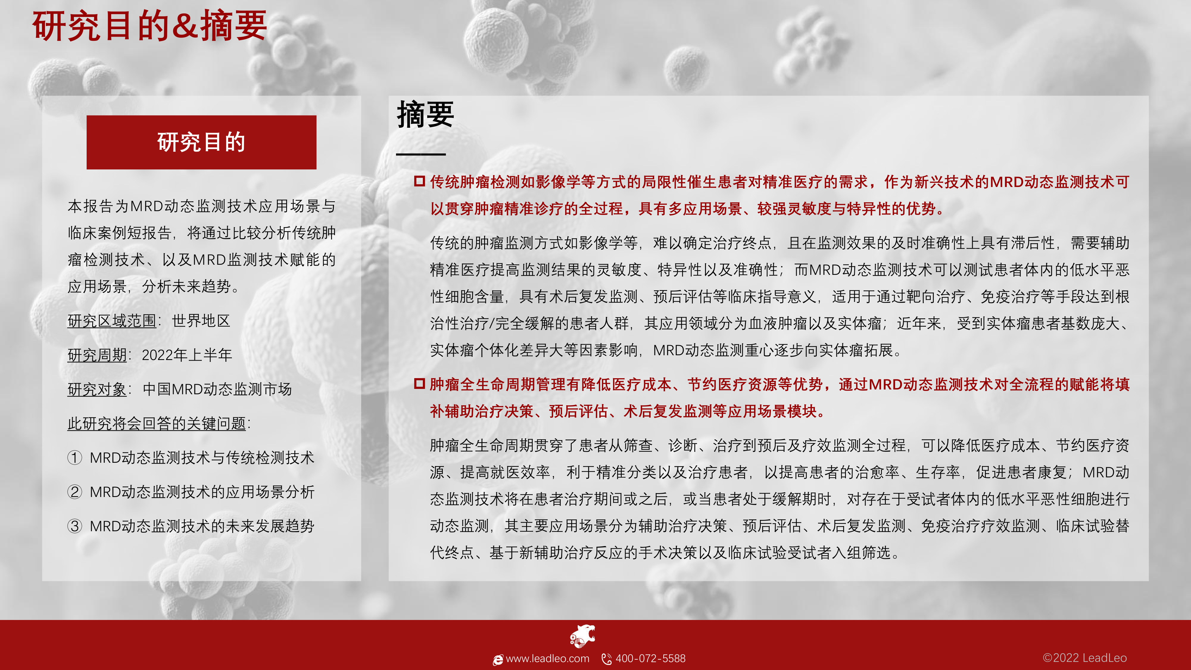 本报告主要从MRD动态监测技术与传统检测技术的比较,以及MRD动态监测技术的应用场景分析和未来发展趋势展望三个方面展开论述。