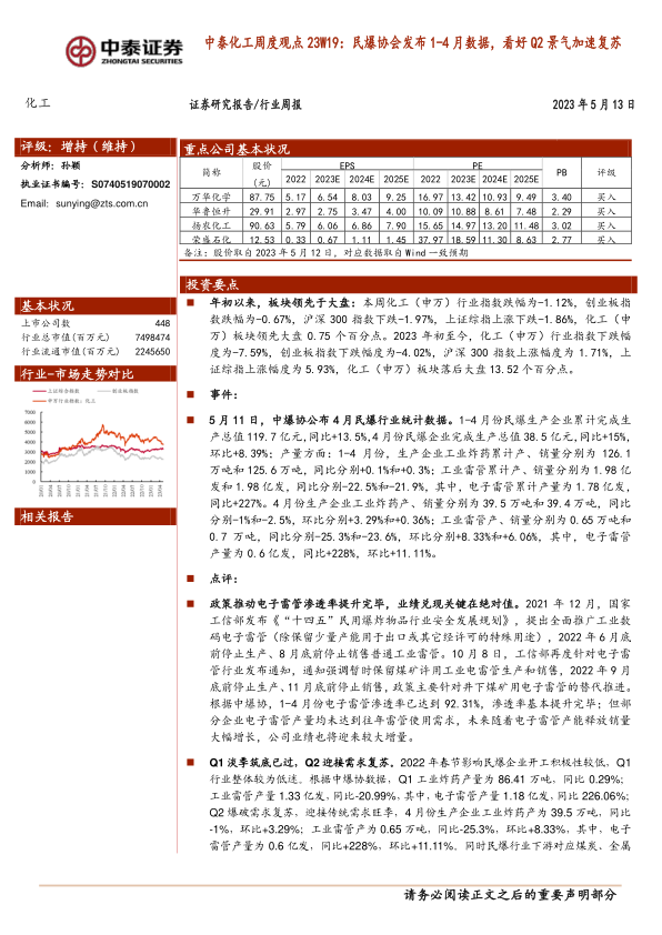 本报告的核心观点是:化工行业整体表现略好于大盘,但年初至今仍落后于大盘;民爆行业在政策推动下电子雷管渗透率已基本提升完毕,Q2有望迎来需求复苏,业绩增长关键在于绝对值;部分化工产品价格涨跌互现,建议关注龙头白马企业以及受益于政策驱动和消费复苏的细分领域。