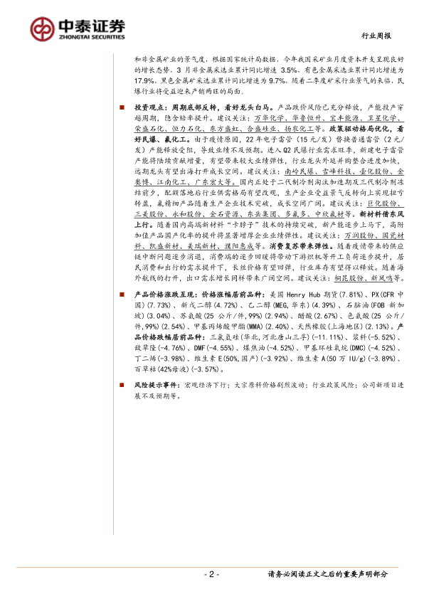 投资观点:周期底部反转,看好龙头白马。产品跌价风险已充分释放,产能投产穿越周期,隐含赔率提升。建议关注:万华化学、华鲁恒升、宝丰能源、卫星化学、荣盛石化、恒力石化、东方盛虹、合盛硅业、扬农化工等。政策驱动格局优化,看好民爆、氟化工。由于疫情原因,22年电子雷管(15元/发)替换普通雷管(2元/发)产能释放受阻,导致业绩不及预期。进入Q2民爆行业需求旺季,新建电子雷管产能将陆续贡献增量,有望带来较大业绩弹性,行业龙头外延并购整合进度加快,远期龙头有望出海打开成长空间。建议关注:南岭民爆、雪峰科技、壶化股份、金奥博、江南化工、广东宏大等。国内正处于二代制冷剂淘汰加速期及三代制冷剂冻结前夕,配额落地后行业供需格局有望改观,生产企业受益景气反转向上实现扭亏转盈,氟精细产品随着生产企业技术突破,成长空间广阔。建议关注:巨化股份、三美股份、永和股份、金石资源、东岳集团、多氟多、中欣氟材等。新材料借东风上行。随着国内高端新材料“卡脖子”技术的持续突破,新产能逐步上马下,高附加值产品国产化率的提升将显著增厚企业业绩弹性。建议关注:万润股份、国瓷材料、凯盛新材、美瑞新材、濮阳惠成等。消费复苏带来弹性。随着疫情带来的供应链中断问题逐步消退,消费端的逐步回暖将带动下游织机等开工负荷逐步提升,居民消费和出行的需求提升下,长丝价格有望回弹,行业库存有望得以释放。随着海外航线的打开,出口需求增长同样带来广阔空间。建议关注:桐昆股份、新凤鸣等。