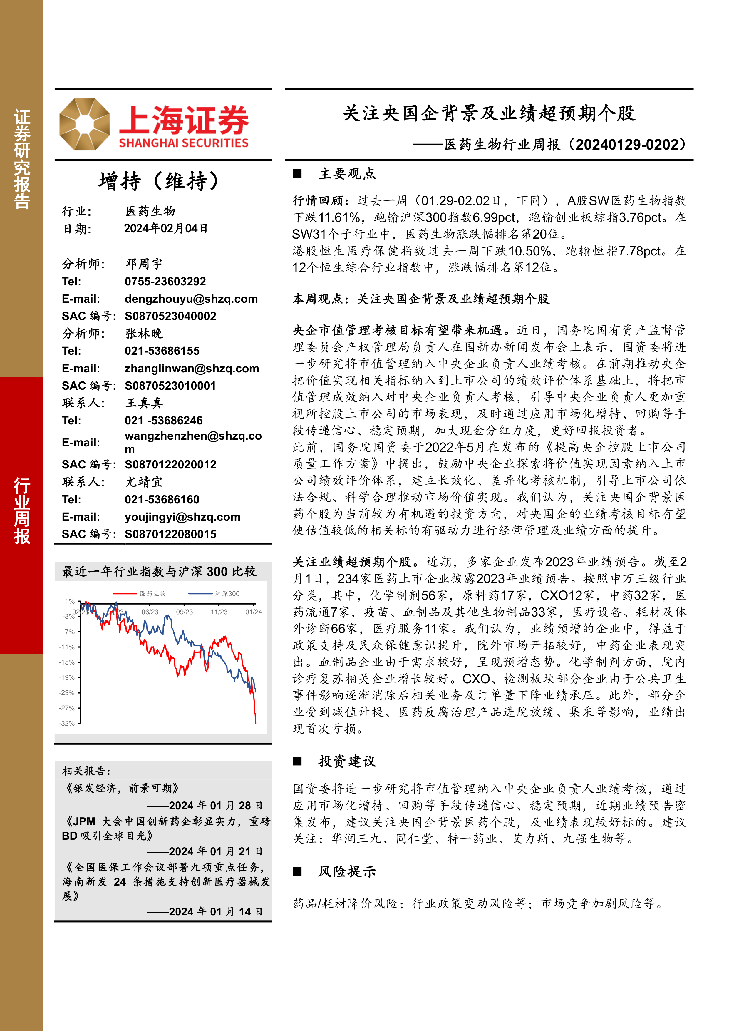 本报告基于国资委政策变化和2023年医药企业业绩预告数据,分析了当前医药行业投资机会。报告建议关注央国企背景的医药个股以及业绩超预期的个股,特别是受益于政策支持和市场开拓的中药、血制品以及院内诊疗复苏相关的化学制剂企业。同时,报告也提醒投资者注意行业潜在风险,谨慎投资。 报告中提供的个股建议仅供参考,不构成投资建议,投资者应根据自身情况进行独立判断。
