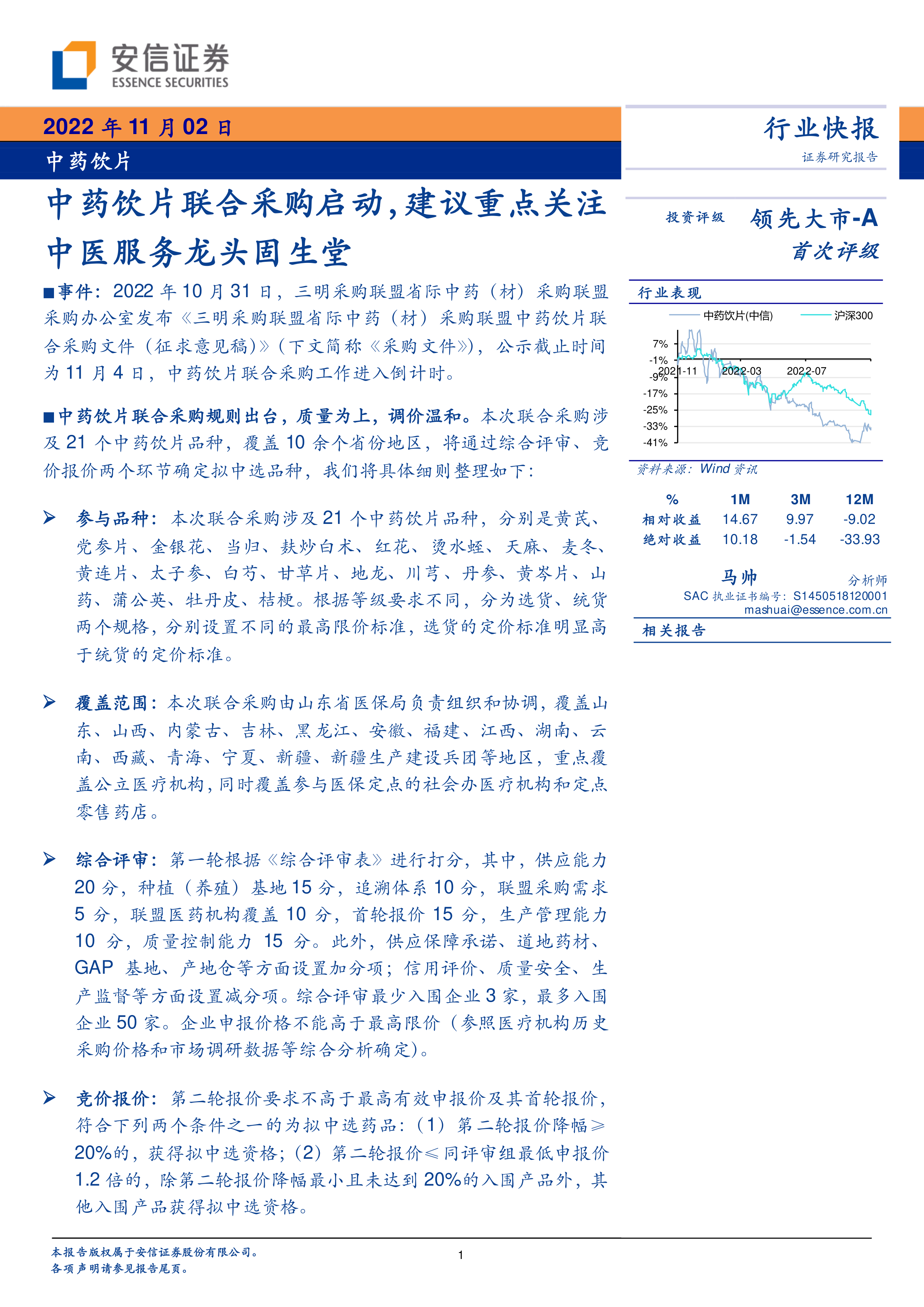 事件:2022 年 10 月 31 日,三明采购联盟省际中药(材)采购联盟采购办公室发布《三明采购联盟省际中药(材)采购联盟中药饮片联合采购文件(征求意见稿) 》 (下文简称《采购文件》 ),公示截止时间为 1 1 月 4 日,中药饮片联合采购工作进入倒计时。