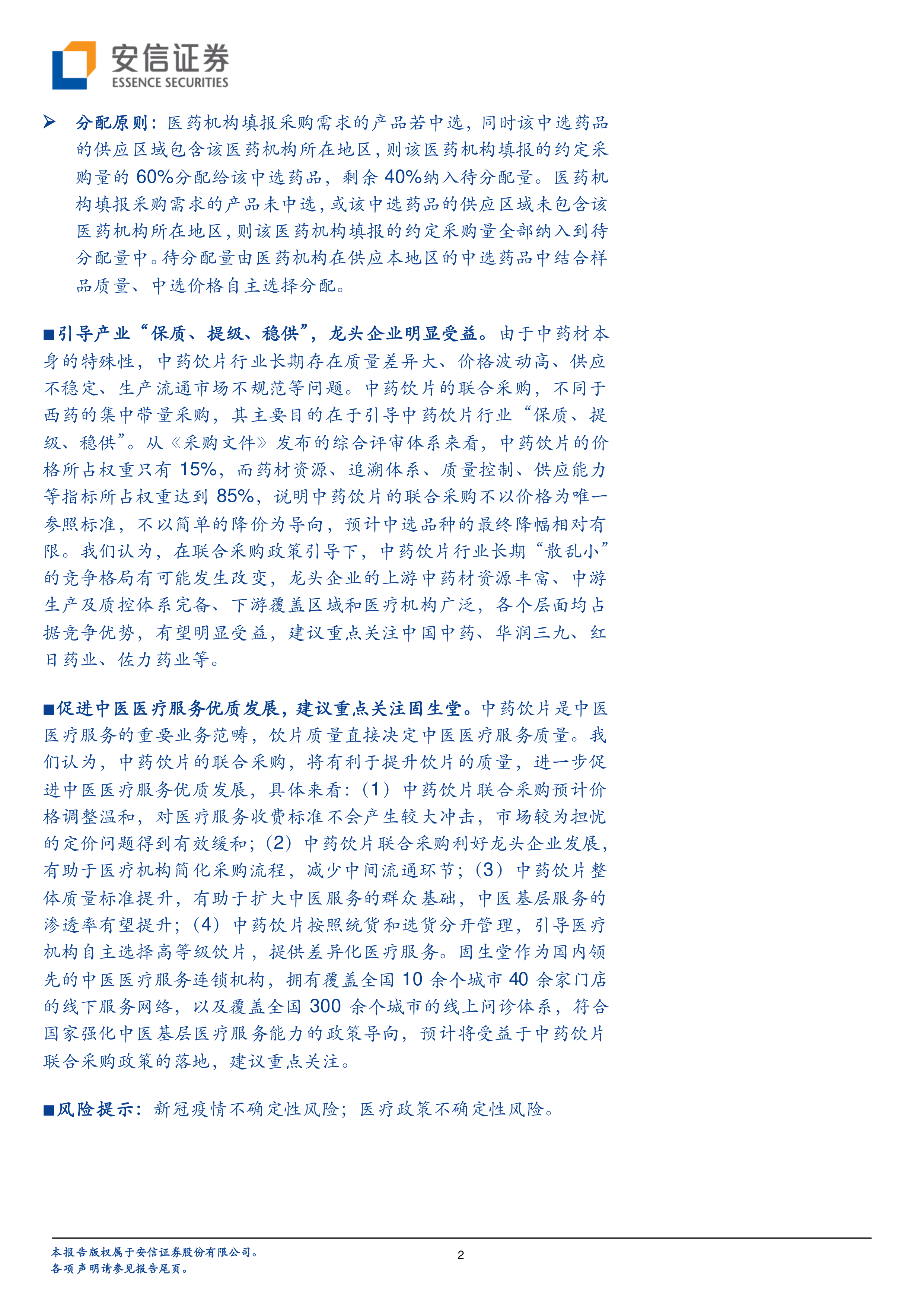 引导产业“保质、提级、稳供” ,龙头企业明显受益。由于中药材本身的特殊性,中药饮片行业长期存在质量差异大、价格波动高、供应不稳定、生产流通市场不规范等问题。中药饮片的联合采购,不同于西药的集中带量采购,其主要目的在于引导中药饮片行业“保质、提级、稳供” 。从《采购文件》发布的综合评审体系来看,中药饮片的价格所占权重只有 15%,而药材资源、追溯体系、质量控制、供应能力等指标所占权重达到 85%,说明中药饮片的联合采购不以价格为唯一参照标准,不以简单的降价为导向,预计中选品种的最终降幅相对有限。我们认为,在联合采购政策引导下,中药饮片行业长期“散乱小”的竞争格局有可能发生改变,龙头企业的上游中药材资源丰富、中游生产及质控体系完备、下游覆盖区域和医疗机构广泛,各个层面均占据竞争优势,有望明显受益,建议重点关注中国中药、华润三九、红日药业、佐力药业等。