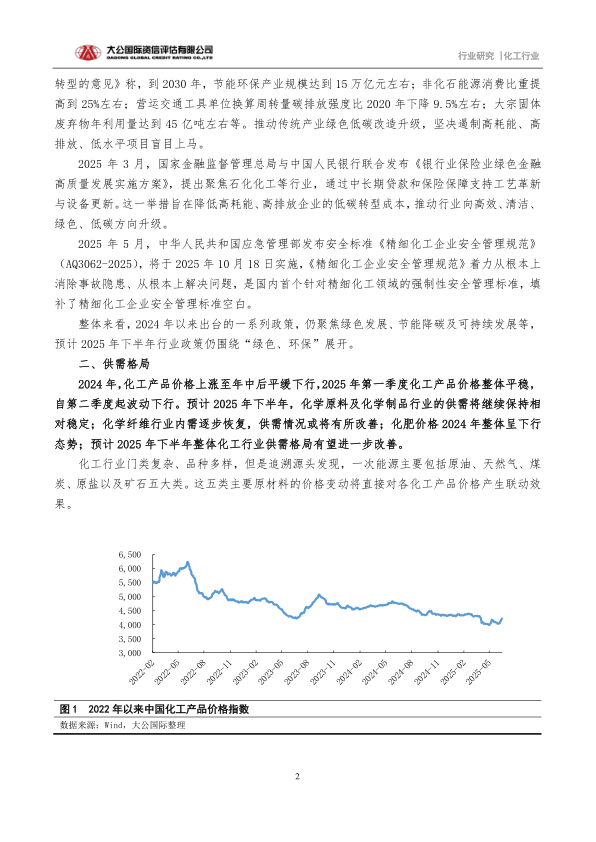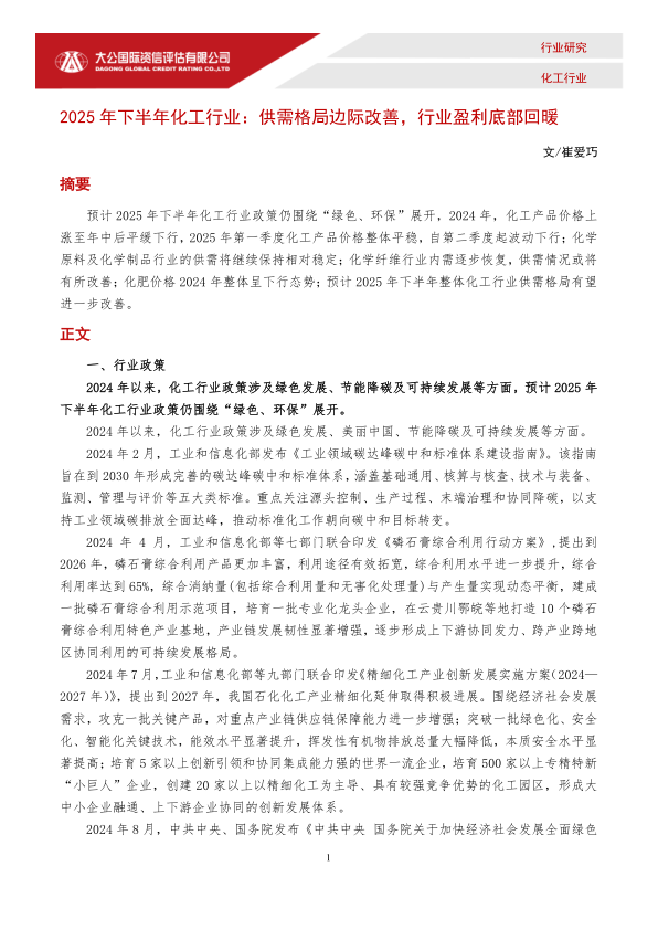预计2025年下半年化工行业政策仍围绕“绿色、环保”展开,2024年,化工产品价格上涨至年中后平缓下行,2025年第一季度化工产品价格整体平稳,自第二季度起波动下行;化学原料及化学制品行业的供需将继续保持相对稳定;化学纤维行业内需逐步恢复,供需情况或将有所改善;化肥价格2024年整体呈下行态势;预计2025年下半年整体化工行业供需格局有望进一步改善。