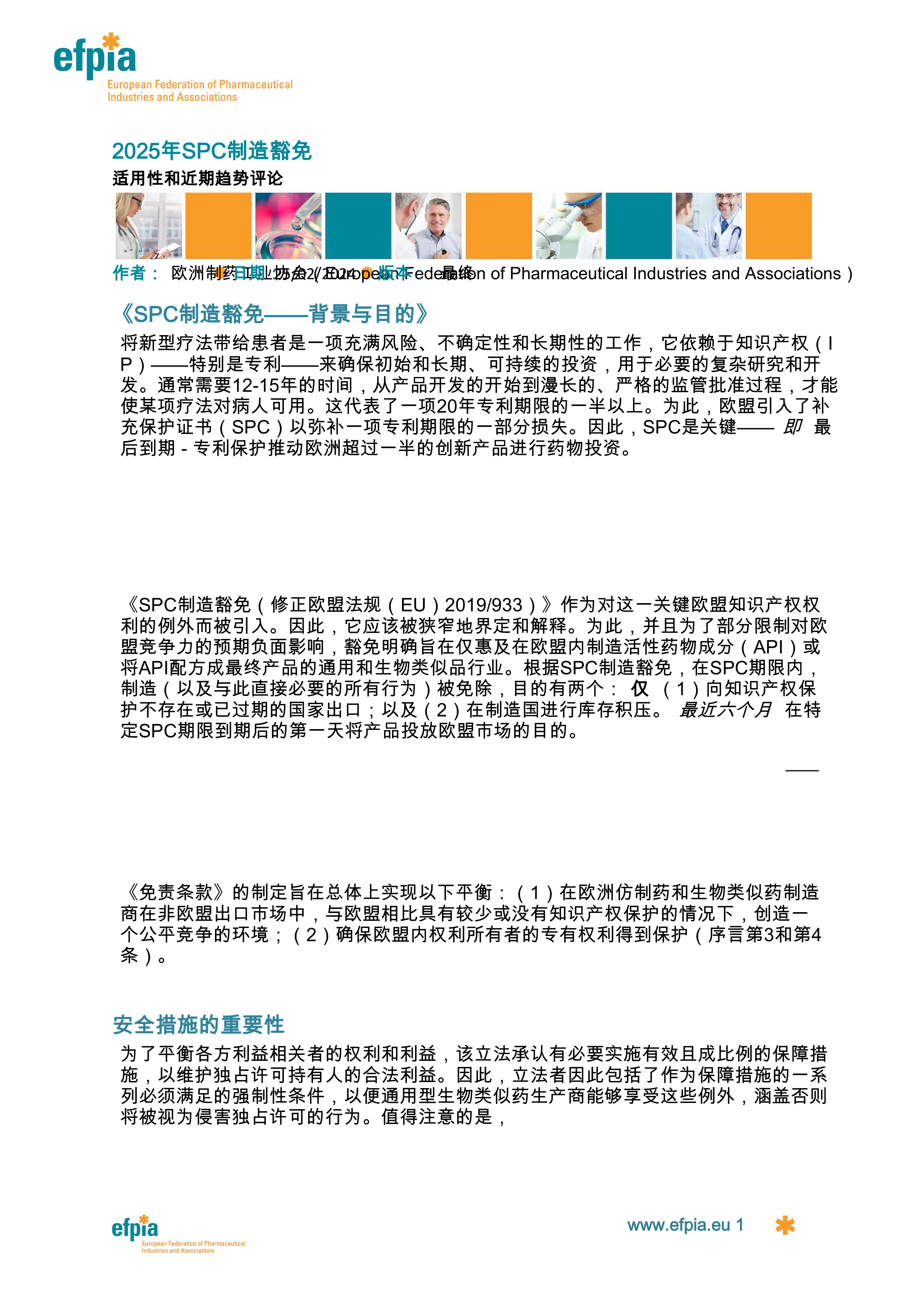 报告对MfE发布的《SPC制造豁免评审:2024年产业报告》进行了批判性分析。该报告基于有限的轶事证据,建议取消或弱化通知要求。EFPIA认为,该报告的结论缺乏可靠的数据支持,其建议将损害欧盟的竞争力和创新能力。EFPIA坚持认为,当前的保障措施是必要的,任何削弱这些措施的举动都将对欧盟的知识产权体系和创新环境造成负面影响。