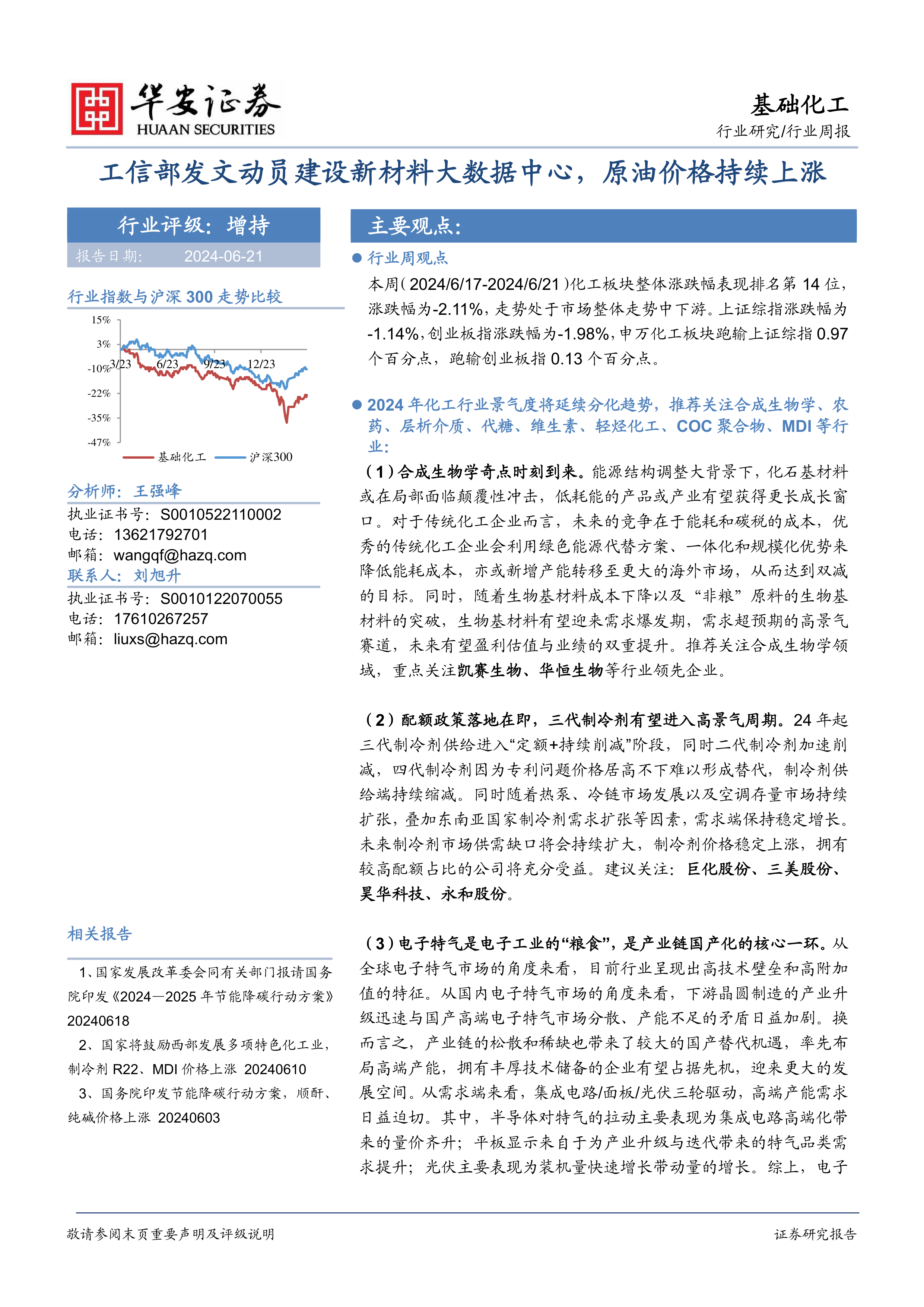 本报告对2024年6月17日至2024年6月21日期间化工行业市场表现、行业动态、供给侧情况以及重点化工产品价格进行了全面分析。报告指出,2024年化工行业景气度分化,部分细分领域面临挑战,部分领域机遇显著。报告重点关注合成生物学、制冷剂、电子特气、轻烃化工、COC聚合物、钾肥和MDI七个细分领域,并对这些领域的市场现状、发展趋势及投资机会进行了分析,最终给出增持化工行业的评级建议。 报告也提示了多种潜在的风险因素,投资者需谨慎决策。
