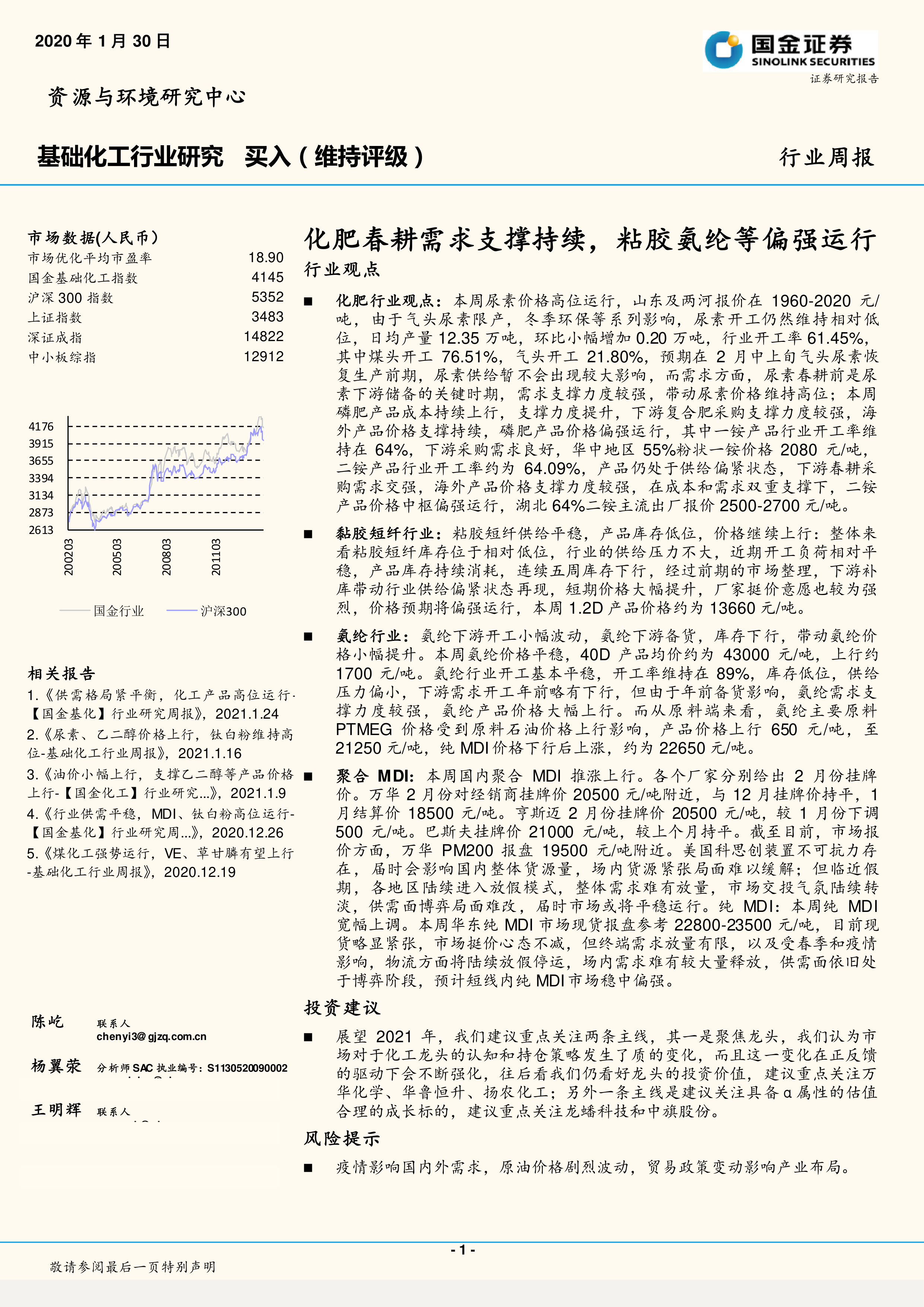 本报告的核心观点是:化肥行业在春耕需求的强力支撑下,尿素和磷肥价格维持高位运行;粘胶短纤和氨纶行业由于供给偏紧、库存低位,价格持续上涨;聚合MDI市场则在供需博弈中稳中偏强。总体而言,基础化工行业在2021年初呈现出结构性分化的态势,龙头企业和具备α属性的成长标的值得关注。