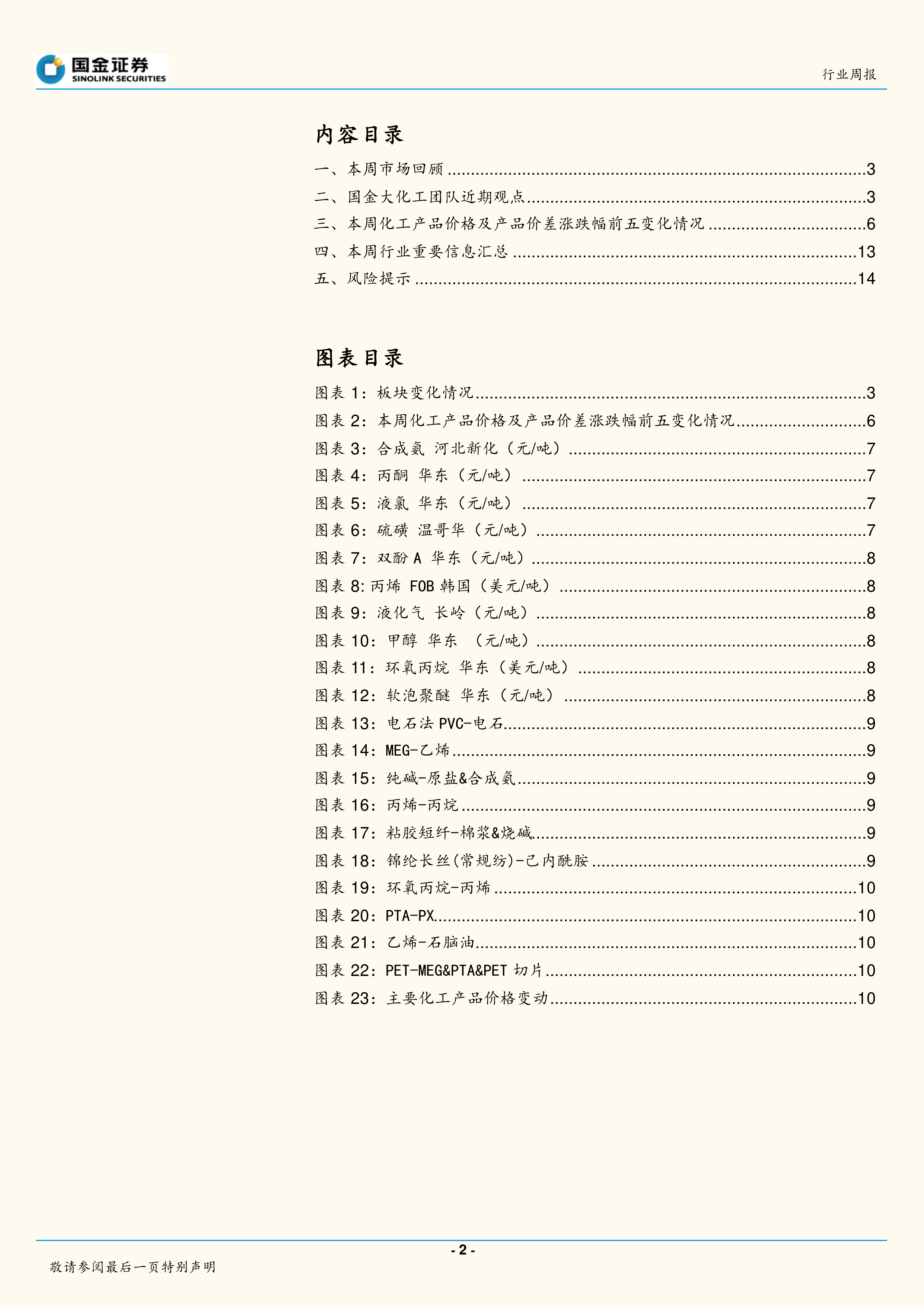 上周布伦特期货结算均价为55.96美元/桶,环比上涨3.88%;WTI期货结算均价为52.86美元/桶,环比上涨5.19%。石化产品价格上涨前五位为合成氨、丙酮、液氯、双酚A、苯酚;下跌前五位为甲醇、环氧丙烷、软泡聚醚、硬泡聚醚、丁二烯。化工产品价格涨幅前五位为硫磺、BDO、无水氢氟酸、甲苯、电池级碳酸锂;下跌前五位为丙烯、液化气、顺丁橡胶、天然橡胶、二甲醚。国金化工重点跟踪的产品价差中,电石法PVC-电石、MEG-乙烯、纯碱-原盐&合成氨、丙烯-丙烷、粘胶短纤-棉浆&烧碱价差增幅较大;锦纶长丝(常规纺)-己内酰胺、环氧丙烷-丙烯、PTA-PX、乙烯-石脑油、PET-MEG&PTA&PET切片价差大幅缩小。上周石化板块跑低指数-2.38%,基础化工板块跑低指数-0.67%。