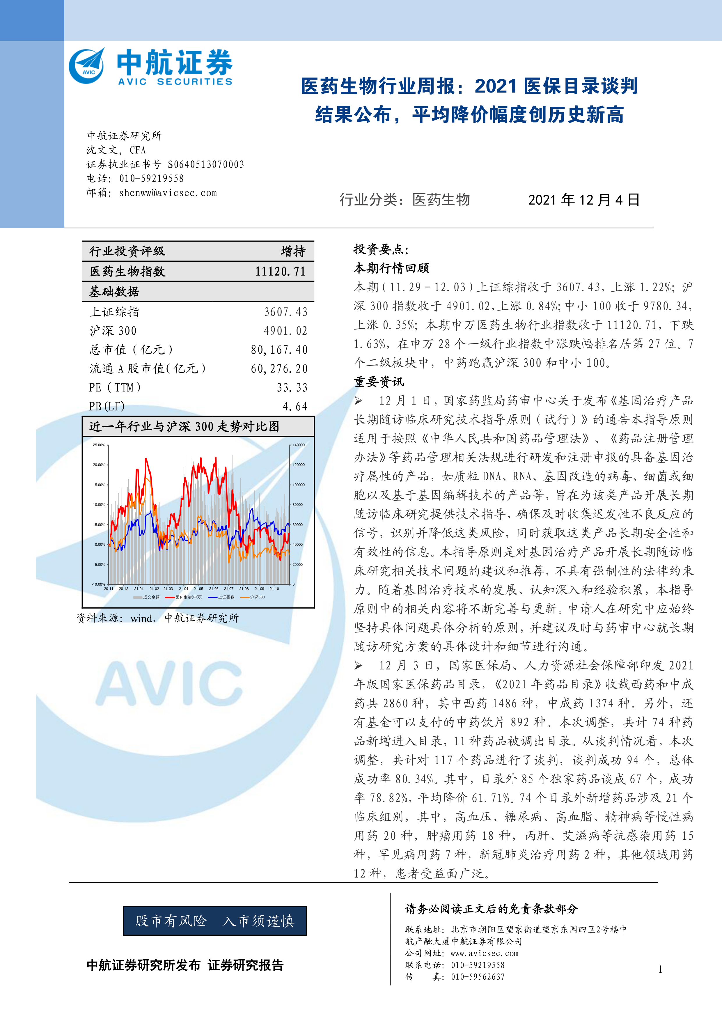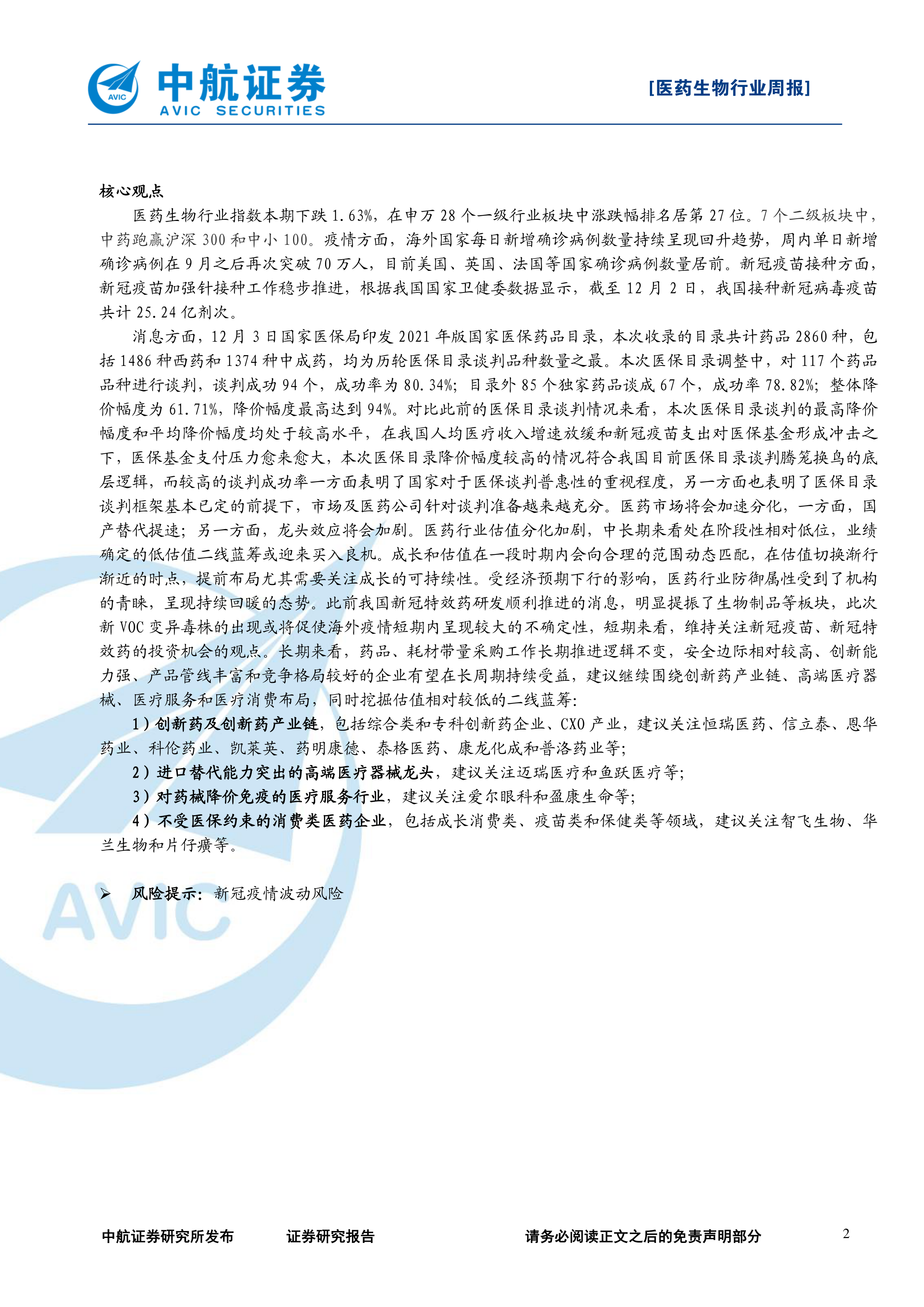 消息方面,12月3日国家医保局印发2021年版国家医保药品目录,本次收录的目录共计药品2860种,包括1486种西药和1374种中成药,均为历轮医保目录谈判品种数量之最。本次医保目录调整中,对117个药品品种进行谈判,谈判成功94个,成功率为80.34%;目录外85个独家药品谈成67个,成功率78.82%;整体降价幅度为61.71%,降价幅度最高达到94%。对比此前的医保目录谈判情况来看,本次医保目录谈判的最高降价幅度和平均降价幅度均处于较高水平,在我国人均医疗收入增速放缓和新冠疫苗支出对医保基金形成冲击之下,医保基金支付压力愈来愈大,本次医保目录降价幅度较高的情况符合我国目前医保目录谈判腾笼换鸟的底层逻辑,而较高的谈判成功率一方面表明了国家对于医保谈判普惠性的重视程度,另一方面也表明了医保目录谈判框架基本已定的前提下,市场及医药公司针对谈判准备越来越充分。医药市场将会加速分化,一方面,国产替代提速;另一方面,龙头效应将会加剧。医药行业估值分化加剧,中长期来看处在阶段性相对低位,业绩确定的低估值二线蓝筹或迎来买入良机。成长和估值在一段时期内会向合理的范围动态匹配,在估值切换渐行渐近的时点,提前布局尤其需要关注成长的可持续性。受经济预期下行的影响,医药行业防御属性受到了机构的青睐,呈现持续回暖的态势。此前我国新冠特效药研发顺利推进的消息,明显提振了生物制品等板块,此次新VOC变异毒株的出现或将促使海外疫情短期内呈现较大的不确定性,短期来看,维持关注新冠疫苗、新冠特效药的投资机会的观点。长期来看,药品、耗材带量采购工作长期推进逻辑不变,安全边际相对较高、创新能力强、产品管线丰富和竞争格局较好的企业有望在长周期持续受益,建议继续围绕创新药产业链、高端医疗器械、医疗服务和医疗消费布局,同时挖掘估值相对较低的二线蓝筹: