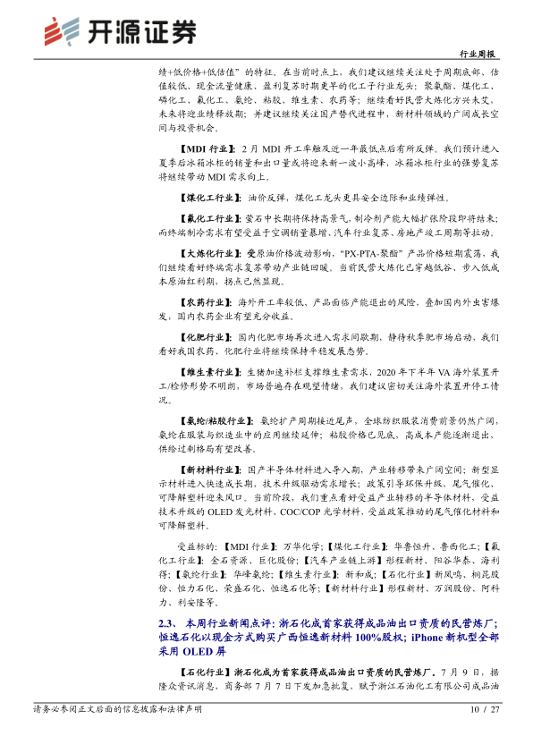 本周化工行业指数较上周五上涨8.95%,跑赢沪深300指数1.4%。报告对万华化学POE项目、国内宏观经济指标持续向好等行业事件进行了点评,并分析了浙石化获得成品油出口资质、恒逸石化完善产业链布局、国家全面禁止固体废物进口、iPhone新机型全部采用OLED屏等行业新闻对化工行业的影响。报告还对MDI、煤化工、氟化工、大炼化、农药、化肥、维生素、氨纶/粘胶、新材料等多个化工子行业的市场行情和发展趋势进行了分析。