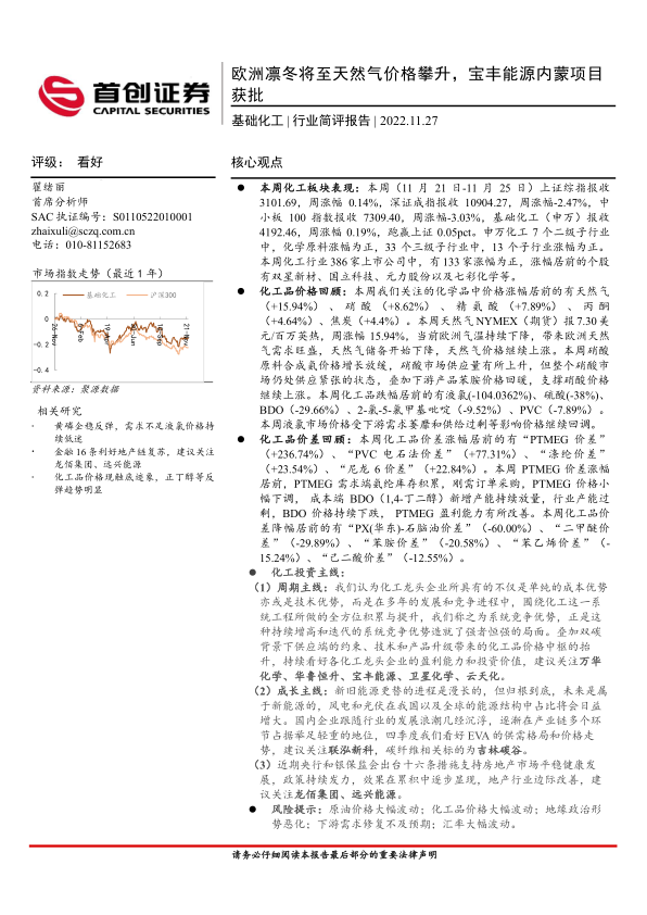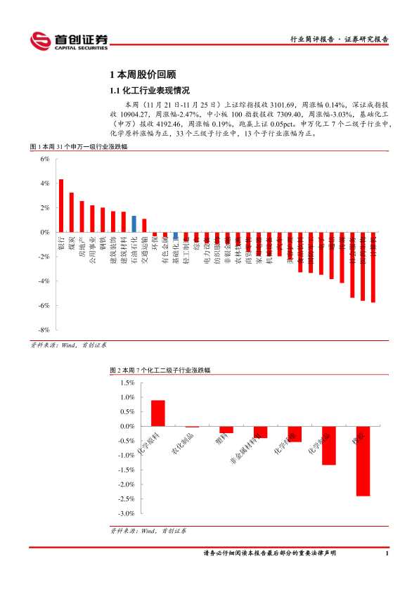 本报告基于首创证券对化工行业一周(11月21日-11月25日)的市场表现进行分析,核心观点如下: