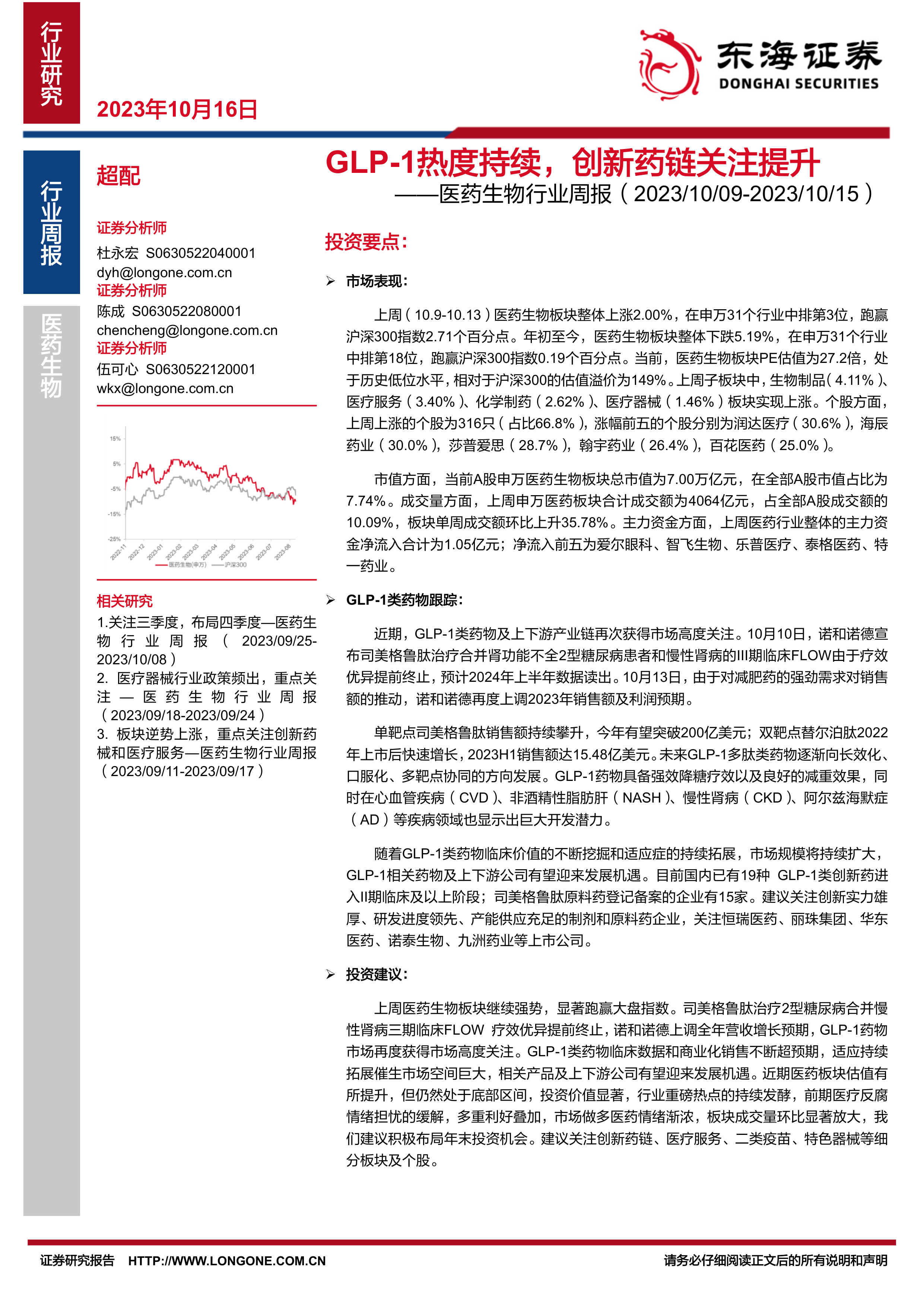 上周(10.9-10.13)医药生物板块整体上涨2.00%,在申万31个行业中排第3位,跑赢沪深300指数2.71个百分点。年初至今,医药生物板块整体下跌5.19%,在申万31个行业中排第18位,跑赢沪深300指数0.19个百分点。当前,医药生物板块PE估值为27.2倍,处于历史低位水平,相对于沪深300的估值溢价为149%。上周子板块中,生物制品(4.11%)、医疗服务(3.40%)、化学制药(2.62%)、医疗器械(1.46%)板块实现上涨。个股方面,上周上涨的个股为316只(占比66.8%),涨幅前五的个股分别为润达医疗(30.6%),海辰药业(30.0%),莎普爱思(28.7%),翰宇药业(26.4%),百花医药(25.0%)。
