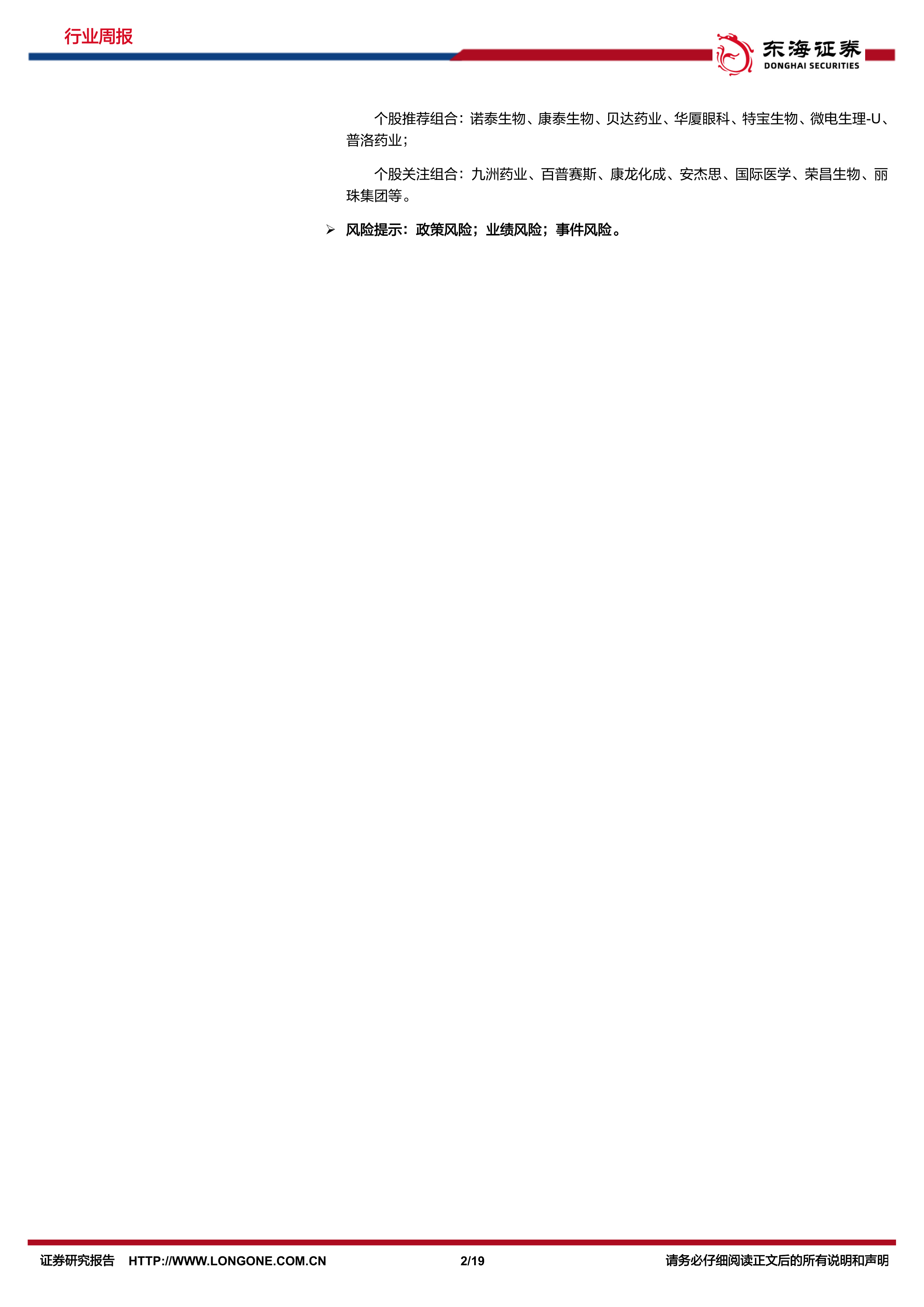 个股关注组合:九洲药业、百普赛斯、康龙化成、安杰思、国际医学、荣昌生物、丽珠集团等。