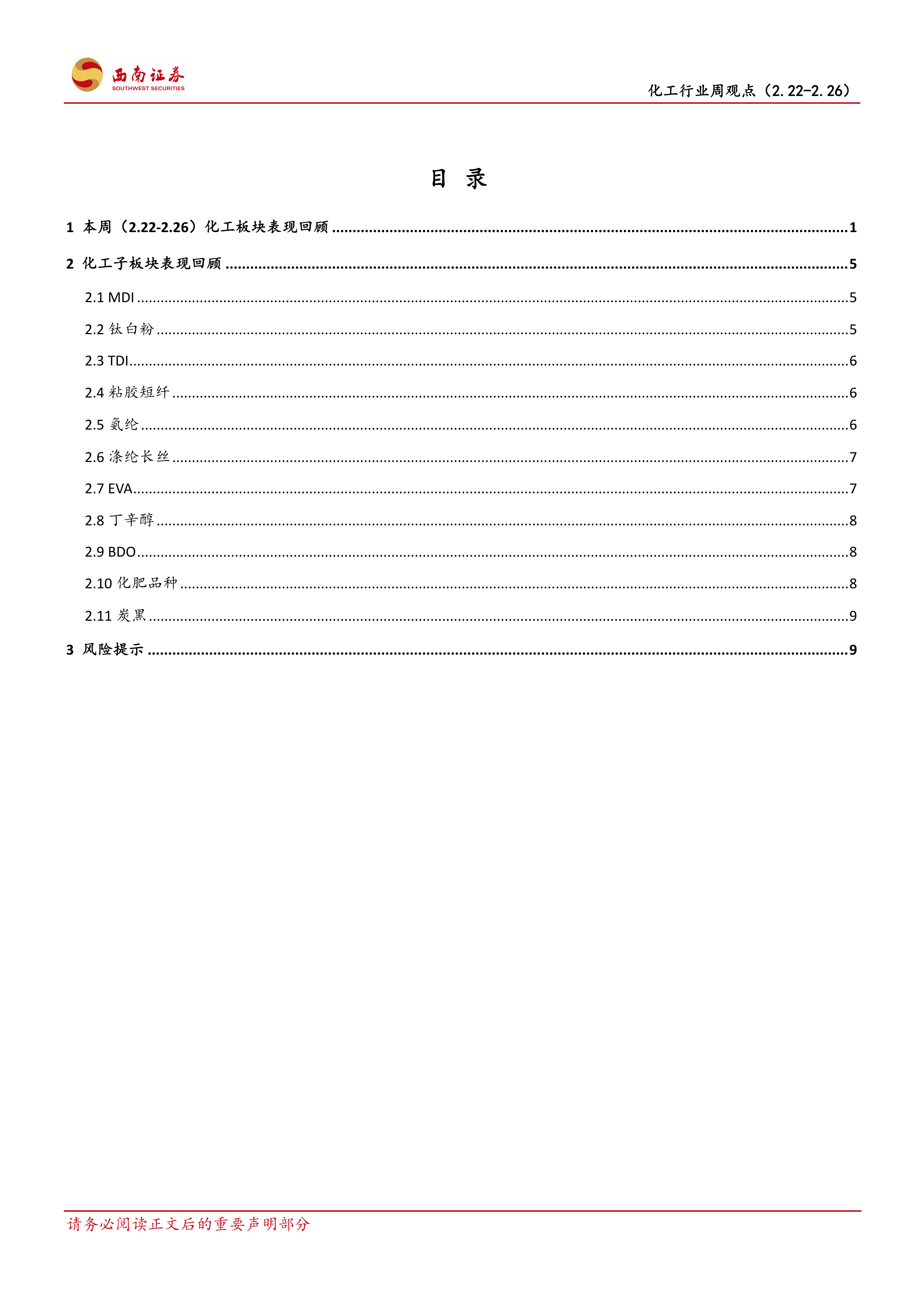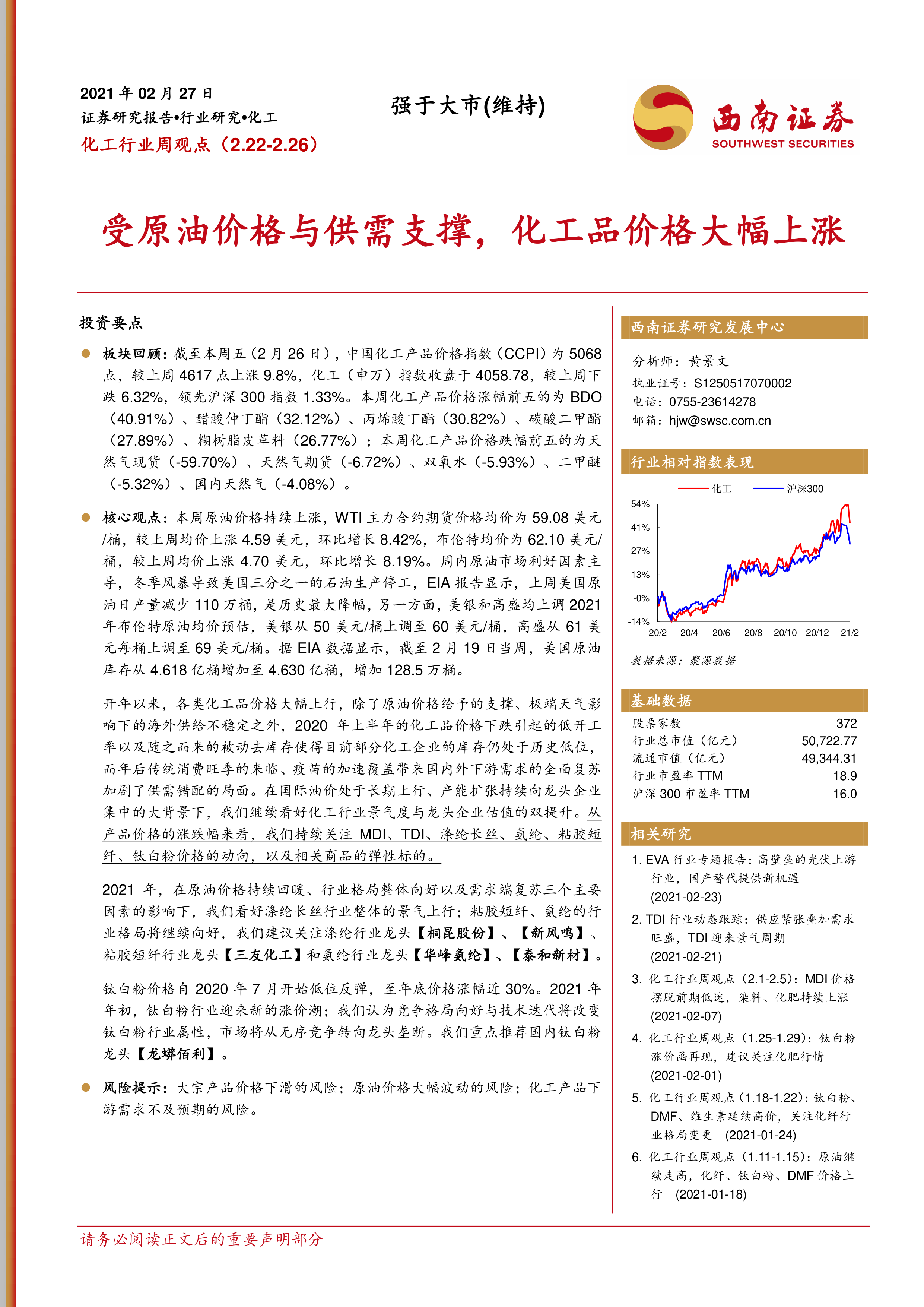 本报告对2021年2月22日至26日化工行业周观点进行了总结,分析了原油价格上涨和供需错配对化工产品价格波动的影响,并对多个化工子板块进行了详细的分析。报告指出,西南证券看好化工行业景气度和龙头企业估值的双提升,并推荐了多家化工龙头企业。 报告也提示了潜在的风险因素,为投资者提供参考。 需要注意的是,报告中的信息和观点不构成任何投资建议,投资者应自行承担投资风险。